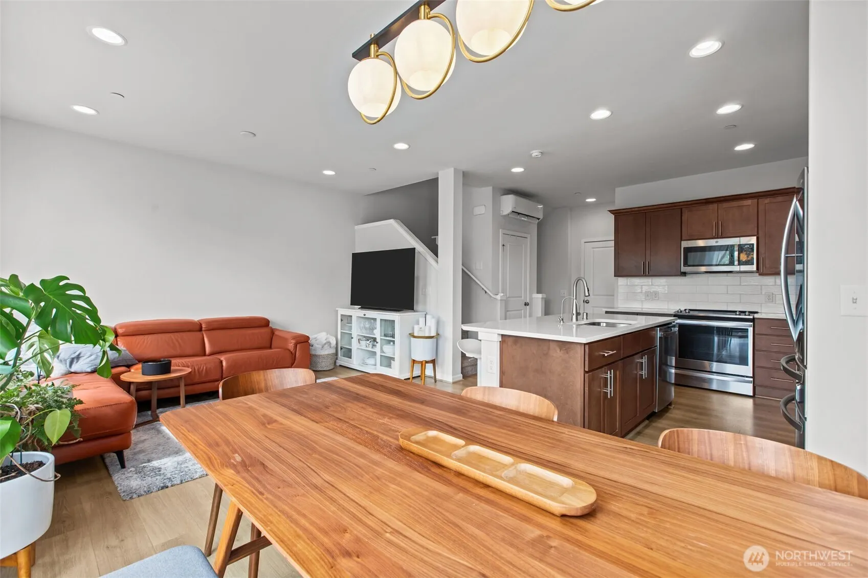 Experience the best of Earlington Village in this exceptional south facing end unit completed in 2021. This home is designed to capture amazing natural light through expansive windows that keep the living spaces bright and inviting year round. Standing out from others in the community, this unit features an additional mini-split system for superior climate control across multiple levels. The thoughtful layout begins on the lower level with a private bedroom and bathroom, offering a versatile space perfect for a quiet home office, guest suite, or extra bedroom with its own patio access. The open level main floor flows seamlessly between an upgraded kitchen featuring high end stainless steel appliances, a huge island, sleek quartz countertops, and upgraded light fixtures. Upstairs you will find three more generously sized bedrooms, including a luxurious primary suite that offers breathtaking views of Mount Rainier. Modern touches like wide plank flooring and designer tile accents elevate the contemporary feel throughout the home. Residents enjoy a close knit community atmosphere with access to a private play area, basketball court, and community garden. Perfectly situated for a modern lifestyle, this home offers easy access to The Landing in Renton for premier shopping, dining, and Topgolf, with minutes away connections to I-5, I-405, and HWY 167 for a seamless commute to Seattle or Bellevue.