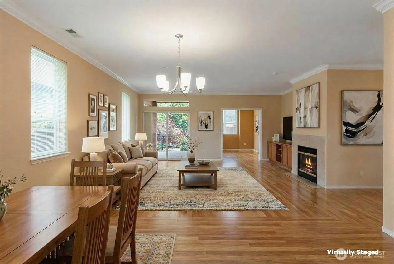 Come see this beautifully maintained, truly turnkey home in the heart of the highly desirable Jubilee 55+ community in Camano Village. Featuring newer solar panels for outstanding energy savings, this light-filled Woodlands model blends comfort, style, & efficiency in one exceptional package. Step inside to discover solid hardwood floors flowing through the main living areas, creating a warm & inviting atmosphere. The spacious kitchen is designed for both everyday living & entertaining, featuring crisp white cabinetry, Silestone countertops, a generous work island with additional storage, & an open breakfast bar adjoining the formal dining area. The welcoming living room offers a cozy gas fireplace, perfect for relaxing evenings. A private den with elegant French doors overlooks the serene backyard retreat, where you’ll enjoy a peaceful water feature, extended paved patio, & mature landscaping that creates a private outdoor oasis. The spacious primary suite easily accommodates a sitting area & features an en-suite bath with double sinks, oversized shower, private water closet, & a large walk-in closet with upgraded shelving. A second bedroom & nearby full bath provide comfort & privacy for guests. Brand new carpet in both bedrooms adds a fresh finishing touch. Additional upgrades include a utility room with extra storage cabinets, garage cabinetry, generator wiring for peace of mind, a newer roof, & newer water heater. Residents of Jubilee enjoy resort-style at it’s finest.