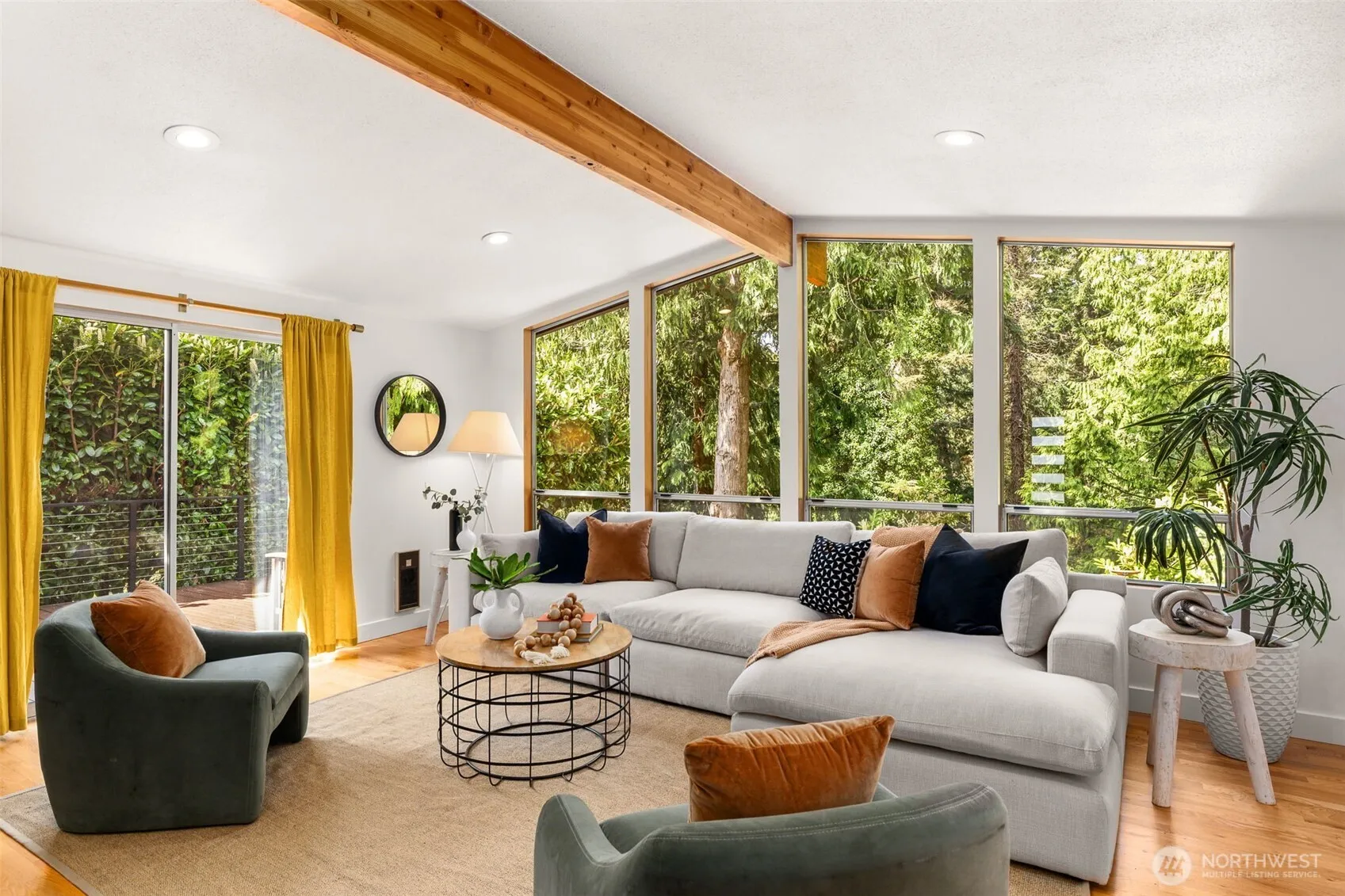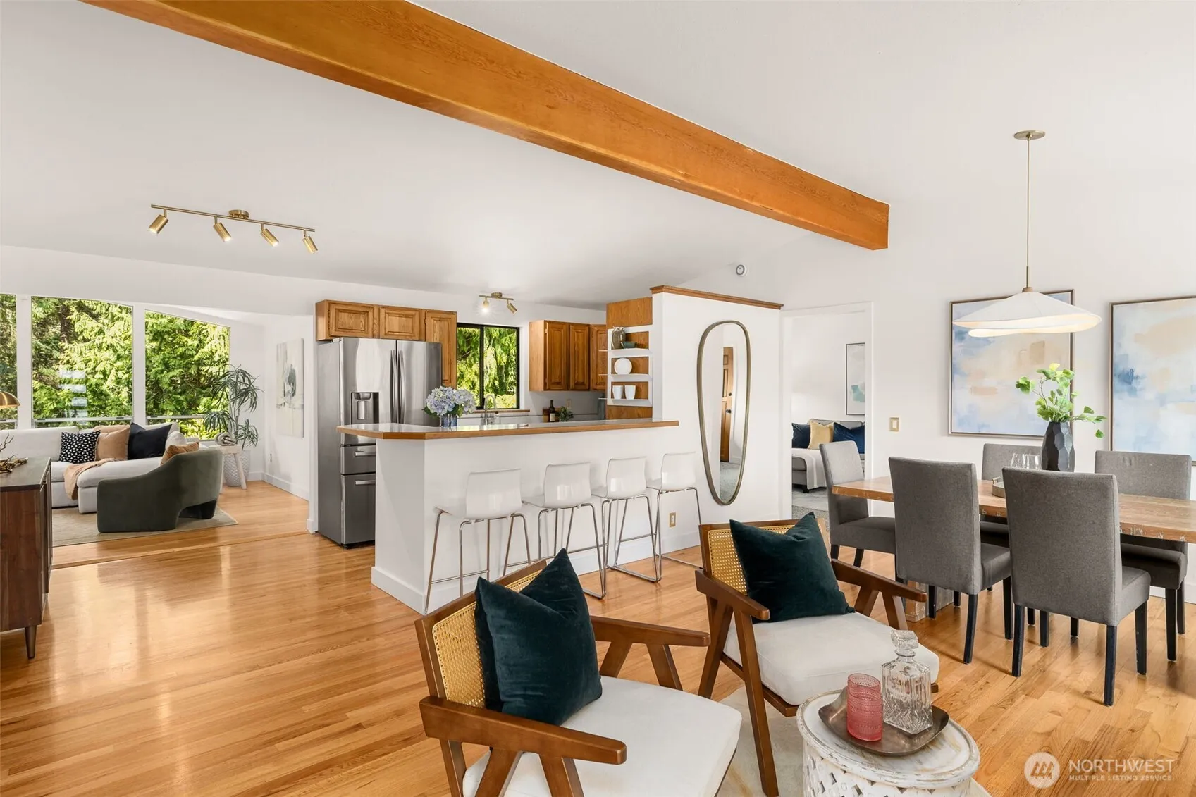 The trifecta: an exceptional location, design-forward mid-century modern style, and supremely functional layout that lives as beautifully as it looks. Tucked into a private, tree-lined setting on a serene ¼-acre lot, this spacious home offers the perfect blend of tranquility and convenience. Backing directly to the Seahurst Park greenbelt and just moments from Olde Town Burien’s restaurants, cafés, & the waterfront, the location is as special as the home itself. Light-filled & thoughtfully updated, this home offers multiple living spaces with flexibility for both entertaining and day-to-day life. Refinished hardwoods add warmth throughout, while an integrated smart home system & high-efficiency EV charger bring modern ease to everyday living. Recent improvements include new plumbing, upgraded electrical, two beautifully renovated bathrooms, new basement windows, and solid core interior doors-with additional updates enhancing the home throughout. The expansive composite deck is a true showstopper, overlooking a lush, tree-filled greenbelt that creates a sense of total seclusion and calm, where mornings feel restorative and evenings unwind beneath a canopy of trees. Paired with the inviting firepit area, the outdoor spaces offer a rare connection to nature and an effortless setting for gathering, relaxing, & entertaining. A dedicated woodshop provides the ideal space for projects, hobbies, or additional storage, completing this peaceful, idyllic Pacific Northwest retreat.