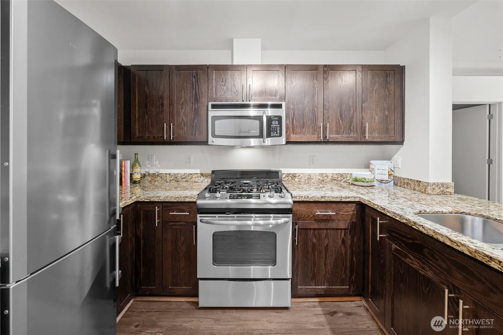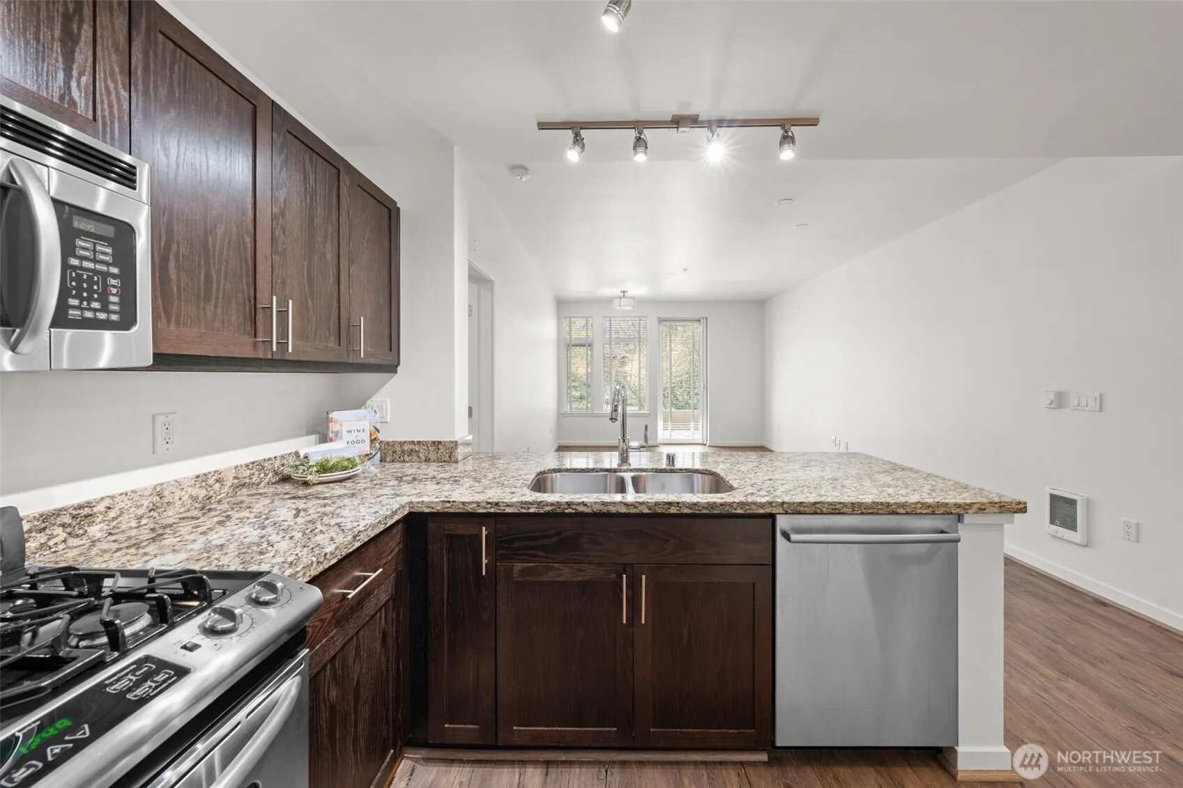 This Burien Town Square Condo is conveniently located just 20 minutes south of Seattle and 10 minutes to Sea Tac Airport. Enjoy peace-of-mind with the secured-entrance and secured garage with two assigned parking spaces. This condo home is move-in ready and is unique with an abundance of natural light throughout. The kitchen offers stainless steel appliances, including a high-end “Liebherr” refrigerator, gas range, and granite countertops. The completely renovated primary bath is pure luxury, featuring an oversized walk-in shower, custom cabinets, a heated towel bar and stone terrazzo floor. Both bedrooms offer an A/C unit, generous walk-in closets, and big windows with a view of the beautiful, lush grounds. The laundry closet includes a convenient large capacity washer and dryer. A French door opens to this home’s private patio and is nestled among the trees and shrubs of the peaceful courtyard. Ammenities include a workout room, BBQ/Picnic area featuring gas-grills, an outdoor fireplace, a community club room where residents gather for coffee and happy hour, and an individual bin in the P-Patch for growing your own produce. The updates to the community infastructure are complete this condo’s assessment is paid in-full! The neighborhood has numerous restaurants, coffee shops, bakeries, breweries and bars with live music, seasonal Farmers Market, library, boutiques and public transit center-All within walking distance. Quick access to quality medical care and nearby beaches.