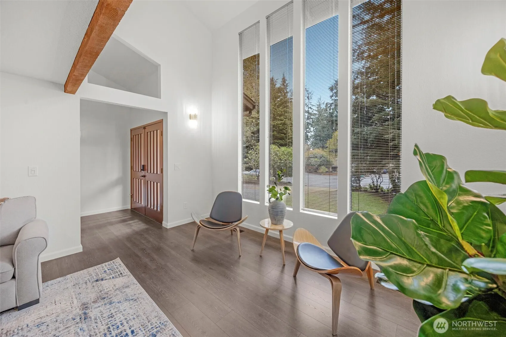 Experience the ultimate Pacific Northwest sanctuary in this stunning Mid-Century Modern masterpiece, perfectly nestled within a private, old-growth forest. The main residence captures the essence of “treehouse living” with soaring vaulted ceilings, exposed architectural beams, and floor-to-ceiling “aquarium” windows that invite the tranquil beauty of the forest into every room. At the heart of the home, a chef-inspired kitchen shines with crisp quartz countertops, high-end stainless appliances, and warm oak cabinetry, flowing seamlessly into an expansive open-concept dining and living area.The crown jewel of this estate is the detached, 500+ square foot studio. Thoughtfully designed with a modern wet bar, half bathroom, skylights, and convenient ramp access, this versatile space is a premier destination for a high-end home gym, creative art gallery, or private guest retreat. Outside, the enchanting grounds are a nature lover’s dream, featuring a seasonal creek with a private wooden bridge, meandering garden trails, and a peaceful fire pit area designed for starlit entertaining.Practical elegance meets timeless character with a light-filled primary suite, updated bathrooms, and a dedicated laundry/mudroom. Located in the heart of Mukilteo, this estate offers rare seclusion without sacrificing convenience. Every detail from the vibrant camellias and lush ferns to the towering cedar canopy, has been curated to offer an unparalleled lifestyle of privacy, peace, and luxury.