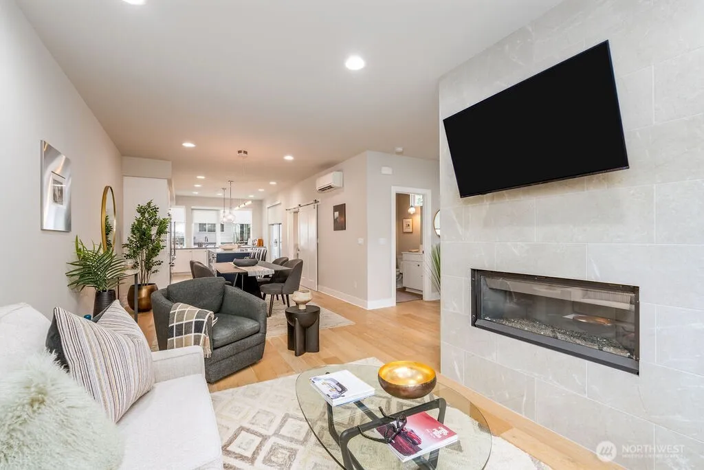 Modern Townhome with Beautiful Sound and Mountain Views on a quiet street. Each level is designed for Modern living! 3 bed 3.25 bath including guest room and full bath on entry level as well as a 2 car garage. Main level features a seamless open floor plan, lots of natural light with living and dining area, office, or reading nook, covered deck (gas hook-up) & Kitchen. Kitchen showcases an enormous island perfect for entertaining. SS appliances, inc gas range, microwave and abundant cabinetry. The primary bedroom with full bath and laundry room complete the 3rd level. There is a large bonus room on the lower level with walk out patio. This beautiful home is surrounded by nature yet minutes away from the ferry, I-5 and freeways.