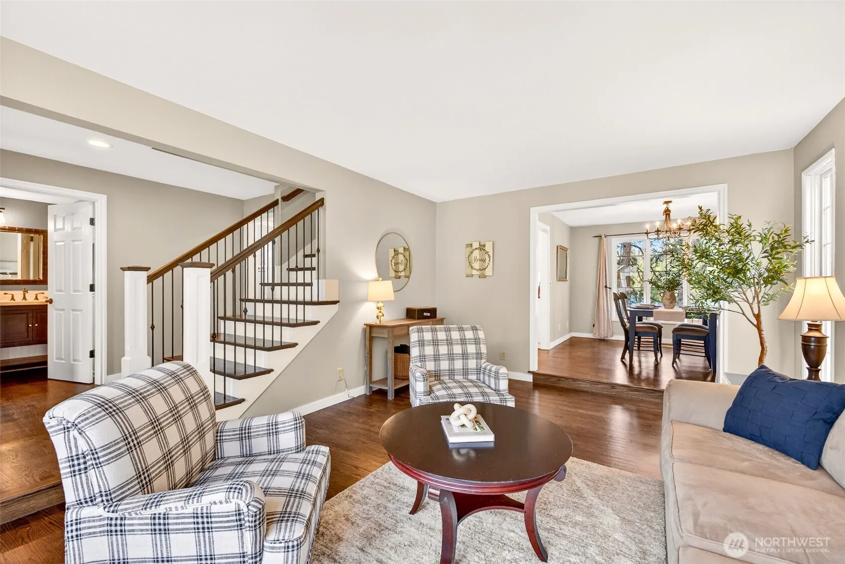 Welcome to one of Coventry’s most beautifully updated homes on a generous 11,257 SF lot in the heart of English Hill. A sweeping driveway, lush lawn, brick accents, and artisan-glass entry set the stage for 2,390 SF of well-designed living space. Inside, updated hardwood floors and a striking staircase with dark treads and iron balusters anchor the welcoming foyer. The updated kitchen features shaker cabinetry, quartz countertops, stainless appliances, subway tile backsplash, island seating, and a built-in breakfast nook with bay windows. The vaulted family room with brick fireplace opens to the updated deck through sliding glass doors. A main-level bedroom/den, updated laundry with utility sink, and powder bath round out the main floor. Upstairs, the primary suite offers a vaulted sitting area with arched window, custom walk-in closet, and a luxuriously updated bath with skylight, heated floors, dual-sink marble vanity, freestanding soaking tub, and floor-to-ceiling tile shower with dual showerheads. Two additional bedrooms and a full hall bath complete the upper level. Outside, a multi-level deck, paver patio, stone fire pit with seat wall, and fully fenced yard deliver exceptional outdoor living. Northshore School District. Walking distance to Sunrise Elementary. Minutes to Microsoft, Google, and major Eastside corridors. English Hill Living at its Best!