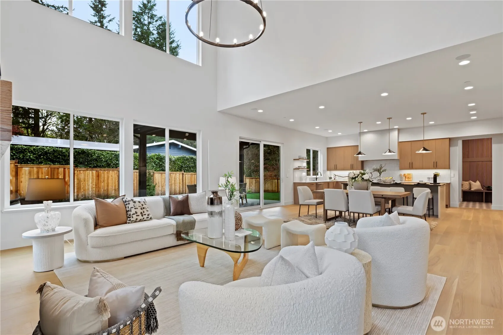 Hamish Anderson Custom Homes, known for Architectural Digest–worthy estates, offers a special limited-edition showcase home. This design-forward NW Contemporary blends warmth, abundant light and sophistication on an oversized, level cul-de-sac lot. Soaring windows surround the home’s central gathering space, where a light-filled great room is anchored by a dramatic two-story gas fireplace clad in large-format stone with organic gold veining and refined slat panel detailing. Chef-caliber kitchen with Thermador appliance suite: French door refrigerator with four freezer drawers and a 48″ pro-grade Wi-Fi-enabled gas range with double ovens. Oversized island topped with leathered quartz and seating for four. Generous informal dining for everyday living, plus formal dining with exposed wood beams and a niche for an heirloom piece. Oversized primary with chandelier, millwork accent wall and sleek ensuite with LED backlit mirrors, tile feature wall, motion lighting, freestanding soaking tub, frameless shower, heated floors and a grand walk-in closet connecting to the laundry room. Outdoor living with ceiling fan, heater prewire and gas stubs for BBQ and fire table. Next-generation Control4 system with newly released sleek lighting keypads, integrated audio with built-in speakers and prewiring for security. Bonus room with snack bar and beverage chiller. Five bedrooms including three ensuites, one main-level suite featuring double vanity and heated floors.