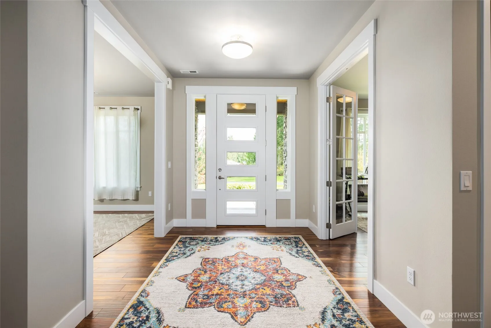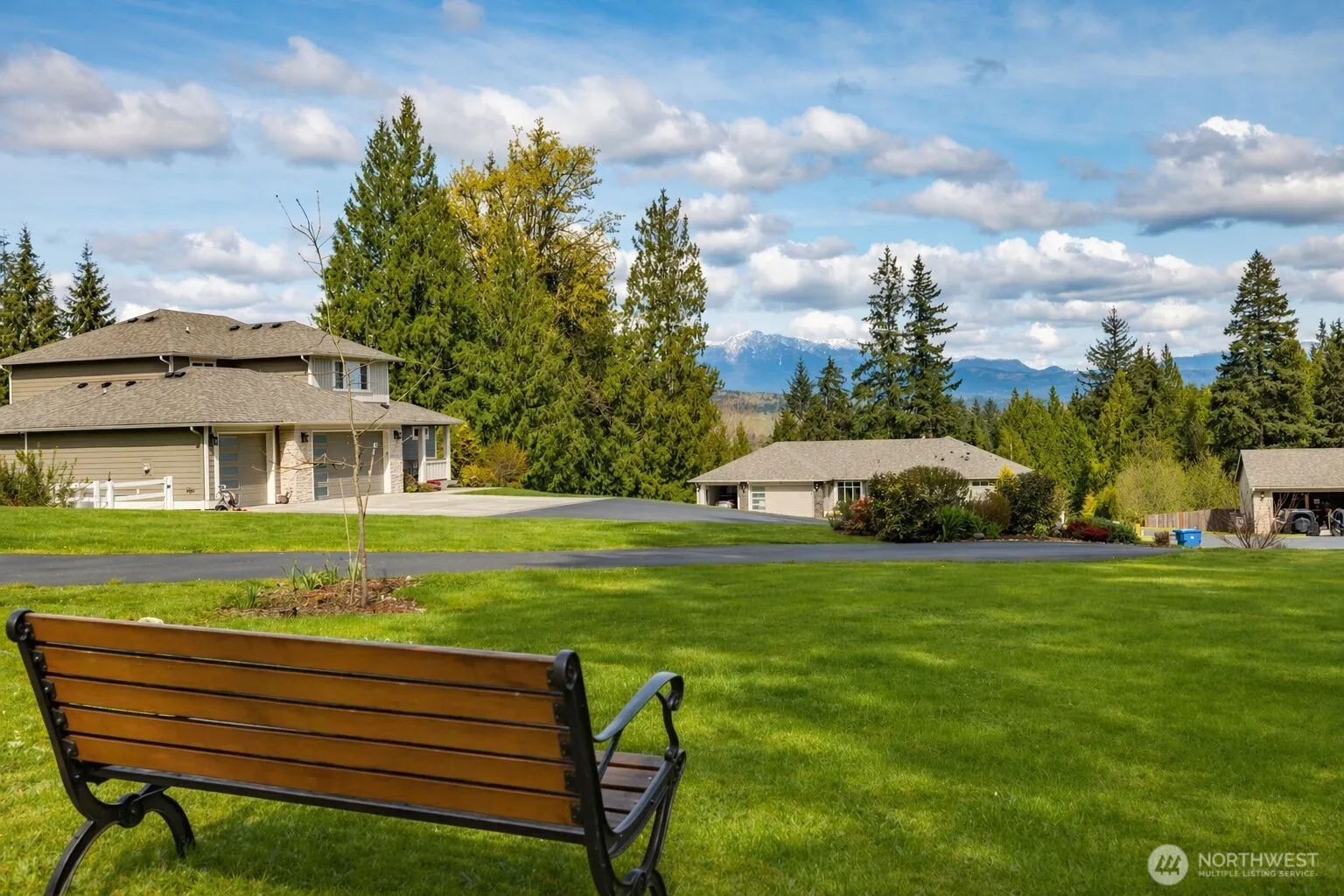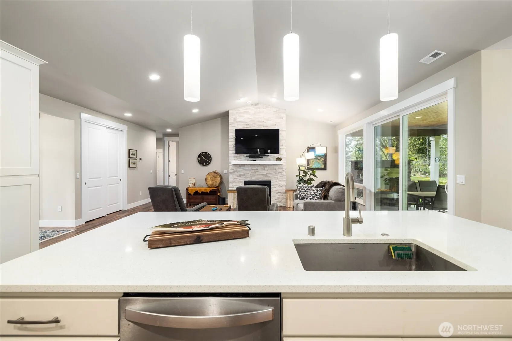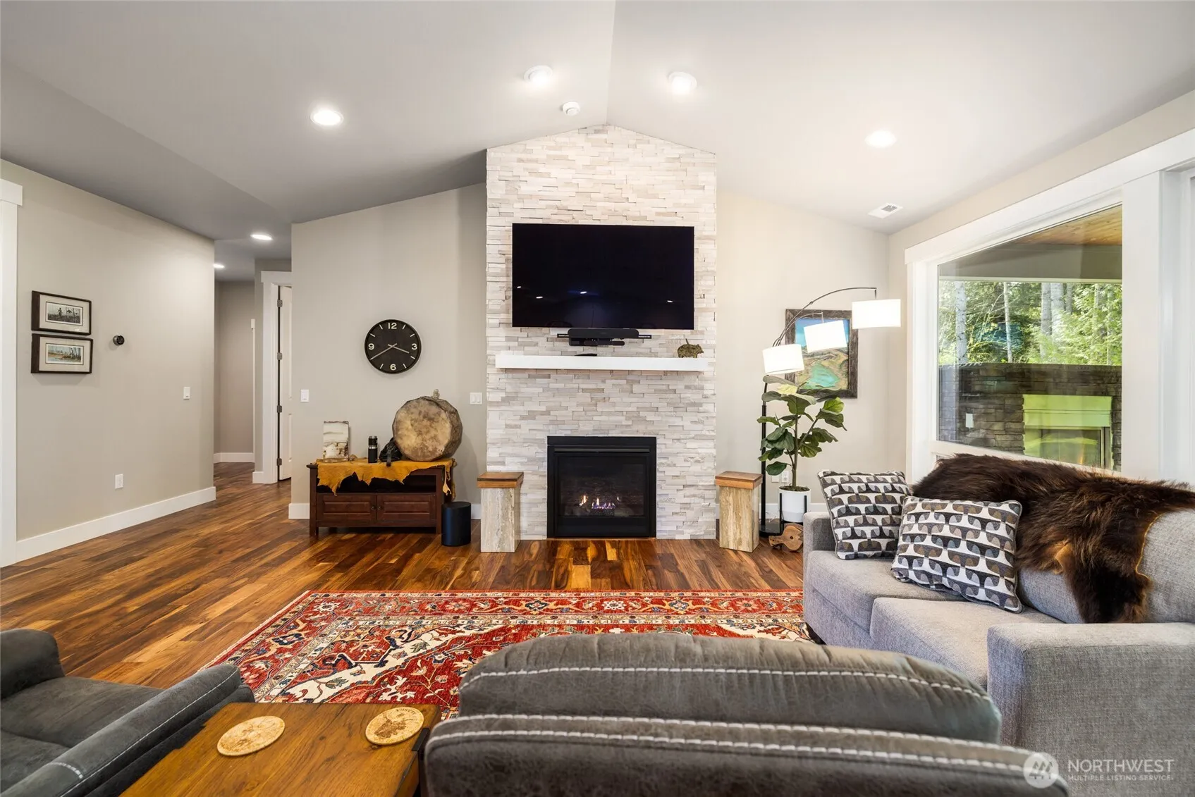 Welcome to the gated community of East Wonderland Park at Flowing Lake, featuring just 23 homes and private lake access with a beach, dock, and picnic area. This beautiful custom rambler sits on a landscaped acre backing to greenbelt, offering privacy, usable space, and scenic mountain views. The open-concept floor plan features vaulted ceilings, 8-foot doors, a bright great room with a floor-to-ceiling fireplace, and acacia hardwood flooring throughout the main living areas. The kitchen includes quartz countertops, a large island, stainless appliances, and ample cabinet space, with seamless flow to the dining area and outdoor living. Enjoy year-round entertaining on the covered patio with an outdoor fireplace, overlooking a level backyard surrounded by mature landscaping and towering cedar trees. The spacious primary suite includes a 5-piece bath and an extra-large walk-in closet. Two additional bedrooms, a den/office, a full bath, a guest bath, and a laundry room with storage complete the functional one-level layout. Additional features include a 3-car garage, RV and boat parking, a whole-house generator, a carbon filter water treatment system, and quality craftsmanship throughout. Conveniently located just minutes from Snohomish while offering a peaceful, private setting.