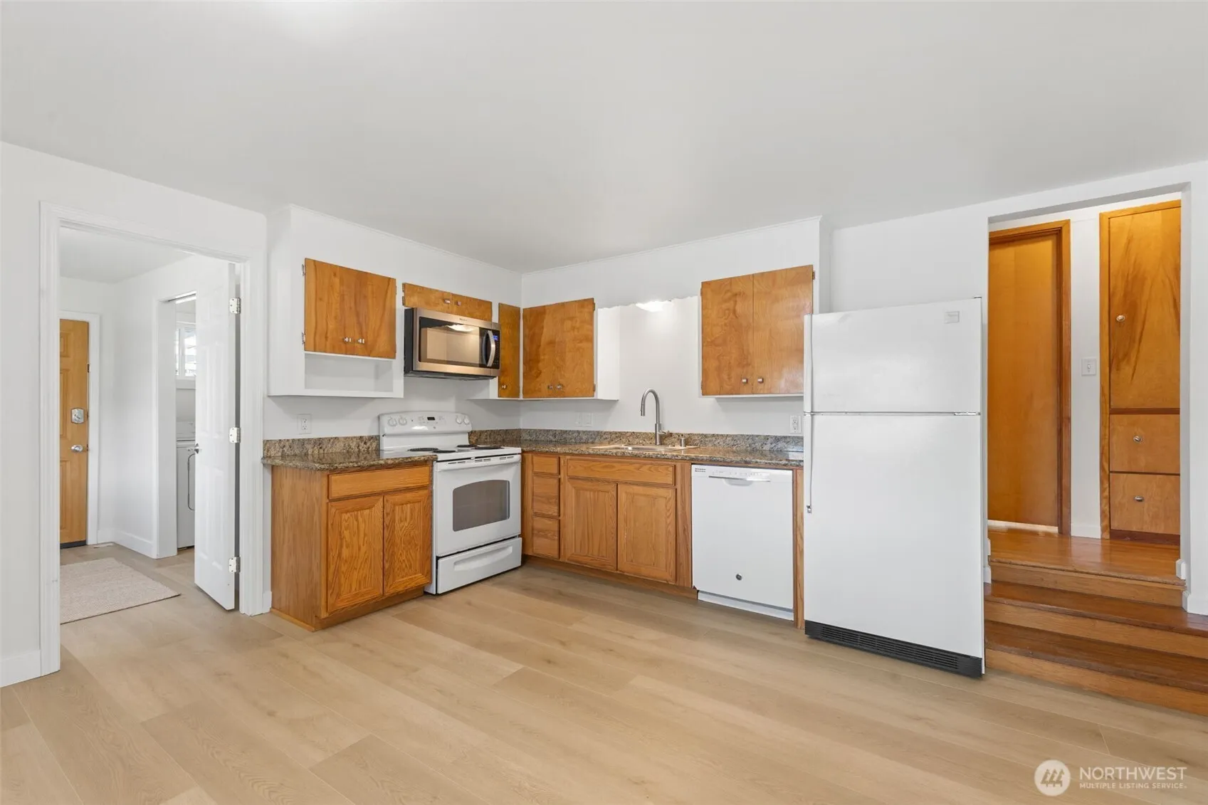Western exposure waterfront home on Deer Island in Lake Tapps offering incredible views, natural light and some of the warmest waterfront living in the area! This charming 2-bedroom, 1-bath home blends classic character with thoughtful updates, featuring original hardwood floors in the bedrooms and an updated bathroom. Enjoy new laminate flooring throughout the living room, kitchen, and spacious family room, along with fresh interior paint and newer windows that enhance comfort and efficiency. The inviting living room showcases an electric fireplace, creating a cozy atmosphere year-round. The home also offers a generously sized updated bathroom and an oversized laundry room for added convenience. Step outside to a large covered patio—perfect for entertaining or relaxing while taking in the peaceful lakefront setting. Situated on a quiet dead-end road, this property provides privacy while remaining close to everyday amenities. Conveniently located near Sumner and Auburn train stations, schools, shopping, and Costco. Located on the westside of the lake, this home features a large lot with plenty of room to grow and the possibility of building a daylight basement or future additions to the home, plus a concrete pathway leading all the way to the lake for easy waterfront access. Complete with a detached oversized one-car garage and positioned as one of the best-priced homes on Lake Tapps, this is a rare opportunity to enjoy true waterfront living. A must-see!