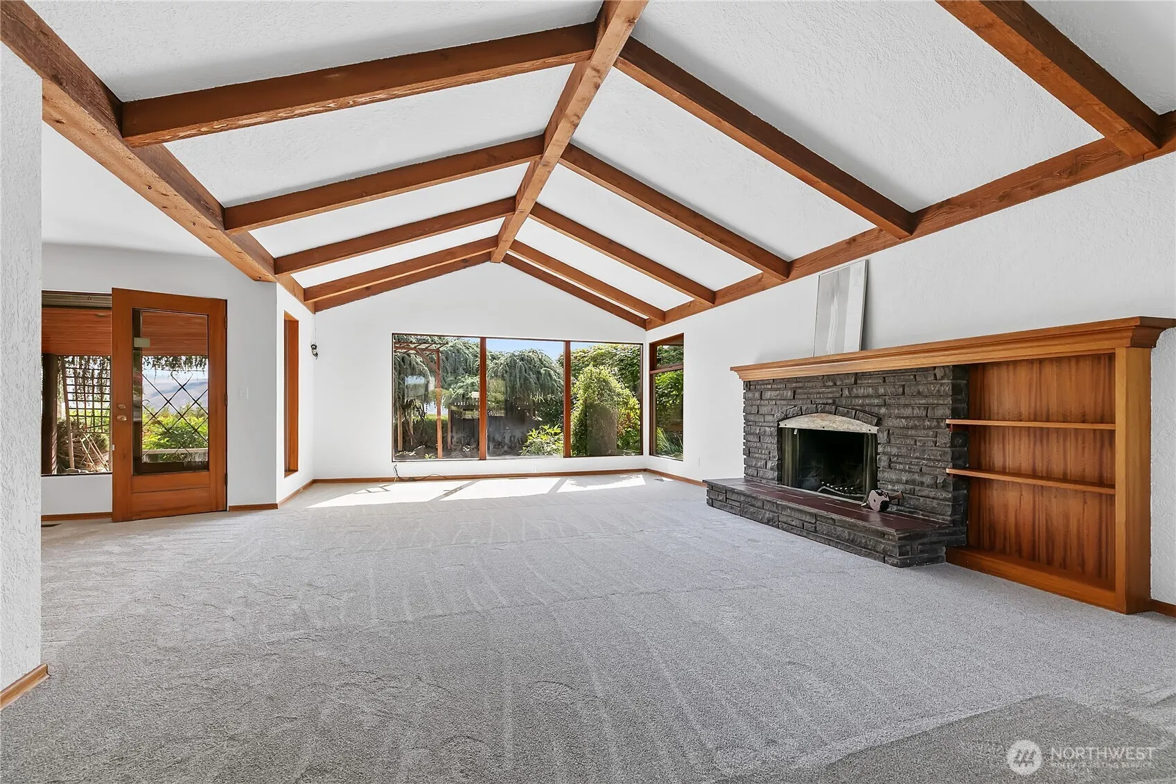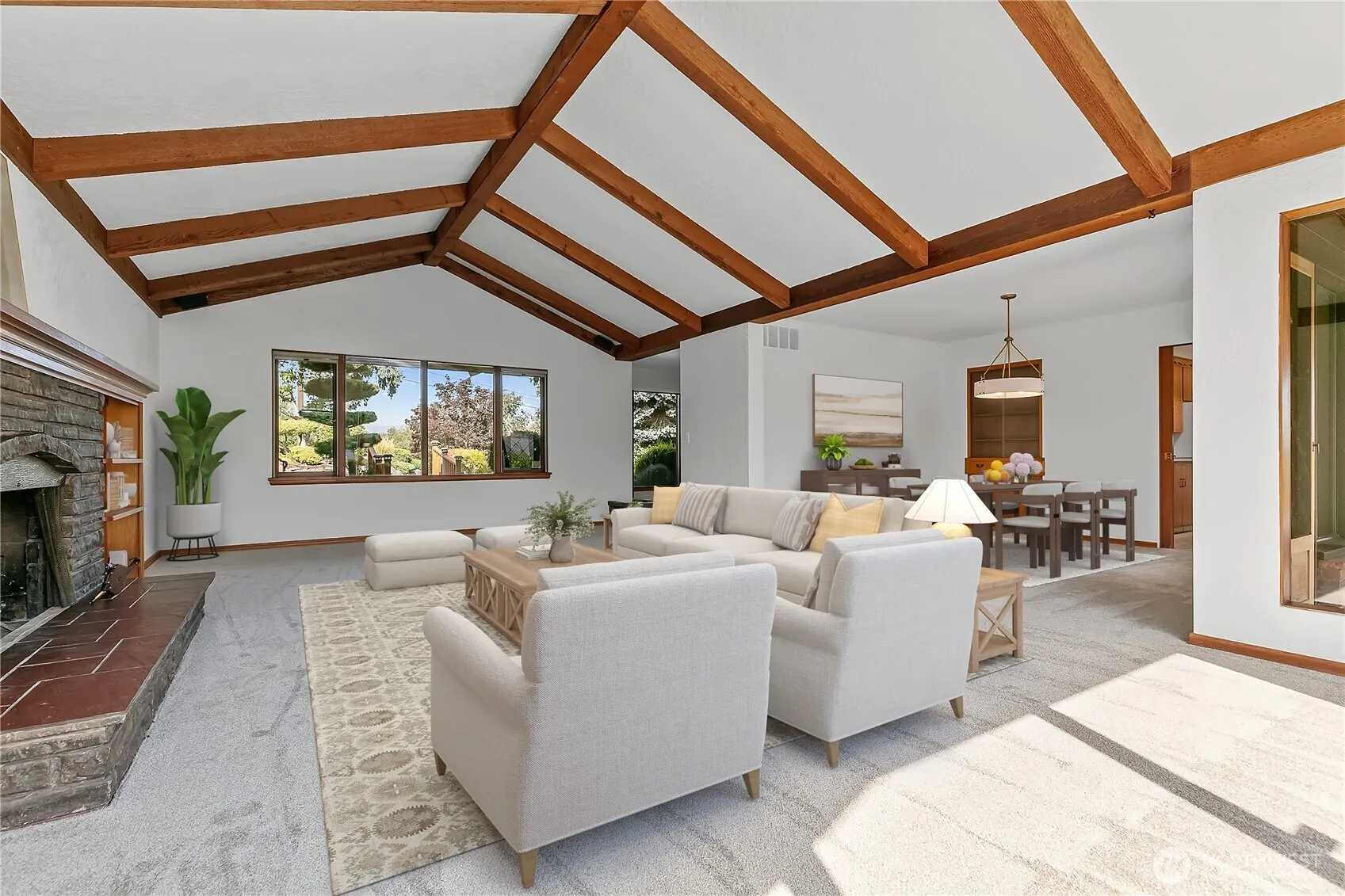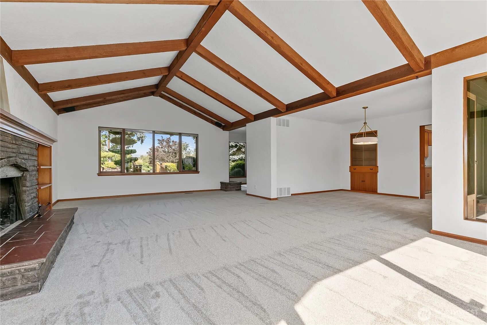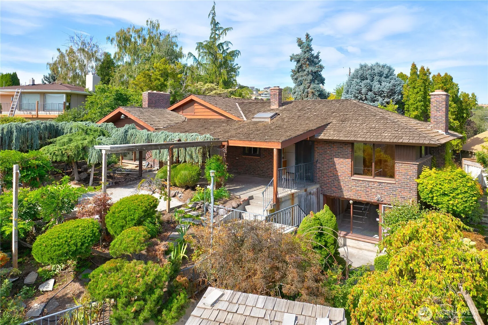 Mid-century home with fresh paint, carpet, lighting and more. With hilltop views overlooking Selah the home has spacious light-filled rooms, with a distinct living/ dining room with vaulted ceilings, wood beams, fireplace, and built-ins. Easy private deck access from kitchen and living spaces which leads further to the groomed garden pathways with mature delightful plantings. Spacious lower level family room with bathroom, storage, and outside access. A rare separate 1241 square foot studio/shop at the base of the hill with two separate walled spaces and half bath.