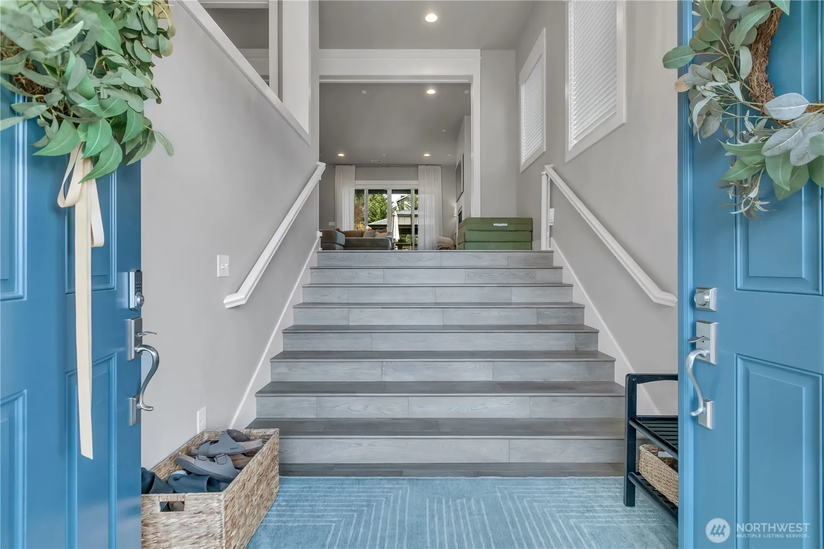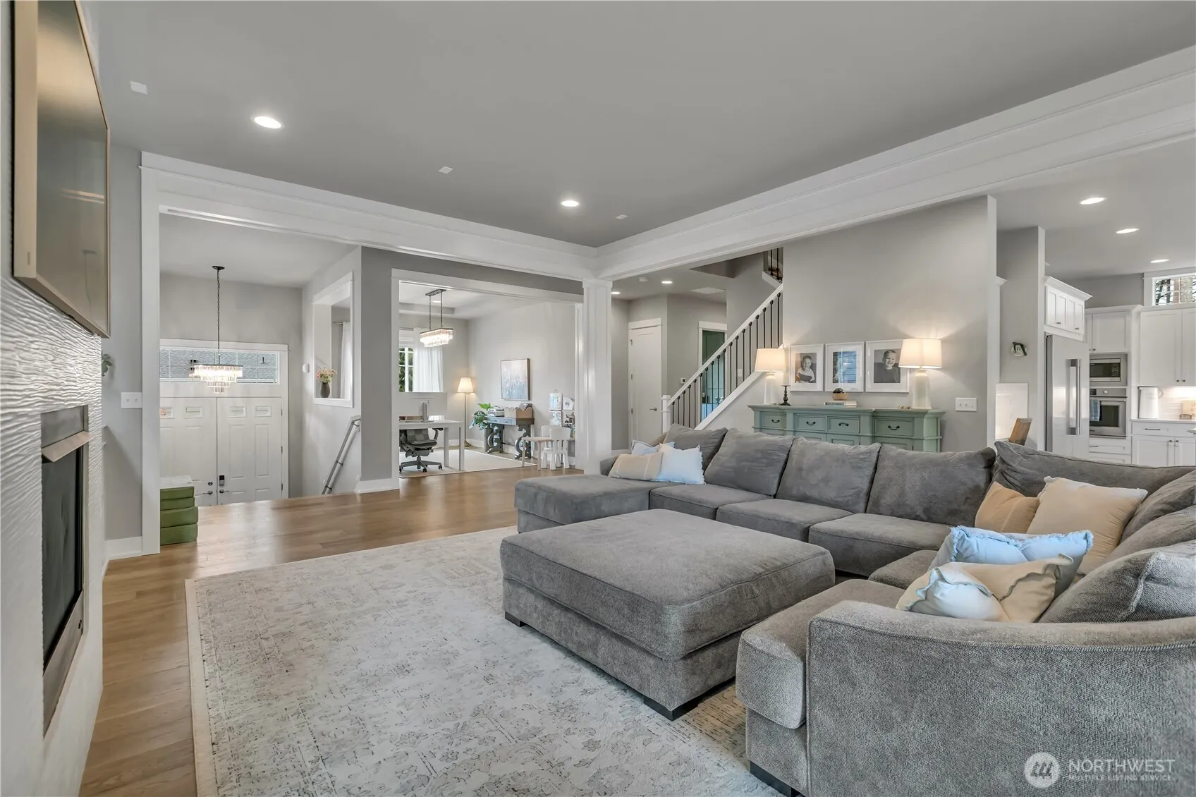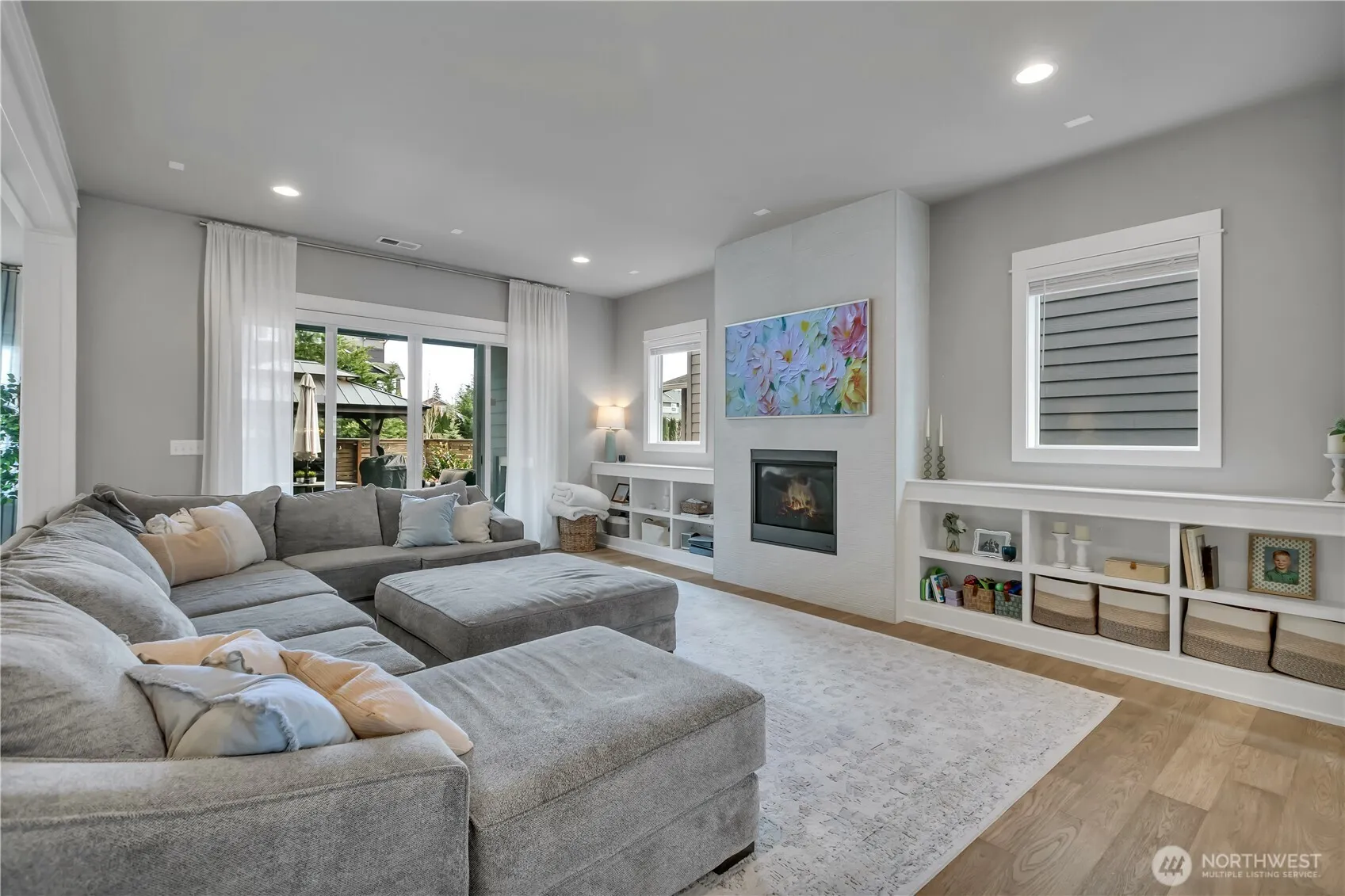Set at the end of a quiet dead-end street beside a forested greenbelt, this impressive multi-level home offers a rare balance of privacy, style, and intention. A welcoming double-door entry opens to a seamless main-floor design, where a floor-to-ceiling stone fireplace anchors the Great Room and French sliders lead to an extended covered patio with its own fireplace—ideal for year-round entertaining. The kitchen is as functional as it is striking, featuring stainless appliances, a commercial-grade refrigerator, pot filler over the gas range, expansive island, and a walk-in pantry that rivals the size of most kitchens. A main-level fourth bedroom or office adds flexibility, complete with French doors to a private balcony. Upstairs, the grand primary suite offers a true retreat with a five-piece bath, dual vanities, and two closets. A large bonus room, two additional bedrooms, and an upstairs laundry room with ample counter space and cabinet storage complete the level. Not a stitch of carpet throughout; engineered hardwood & ceramic tile. ~ $40,000 in upgrades—primarily in professional landscaping—enhance the fully fenced backyard with artificial turf, pergola, and playset. A rooftop deck captures partial Mt. Rainier views and includes furniture. With central A/C, a 3-car garage, finished mudroom, Govee outdoor lights, and access to Tehaleh’s trails and parks in the Sumner-Bonney Lake School District, this home delivers.