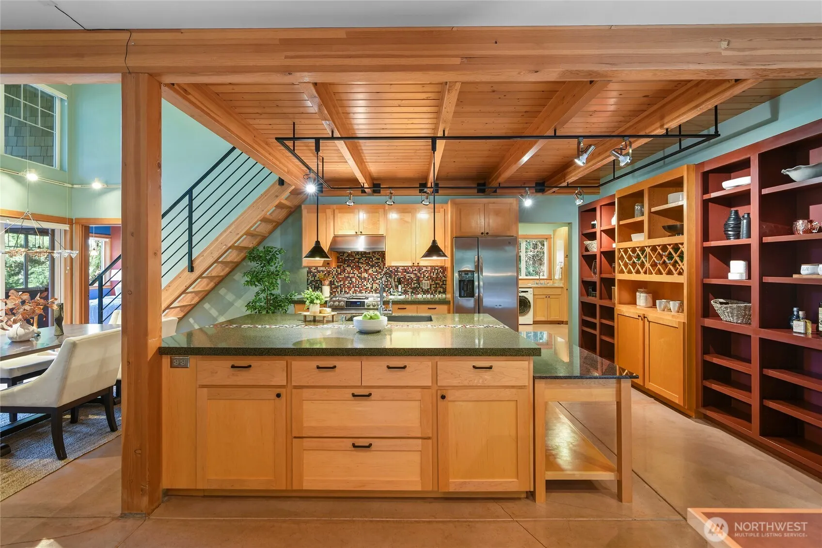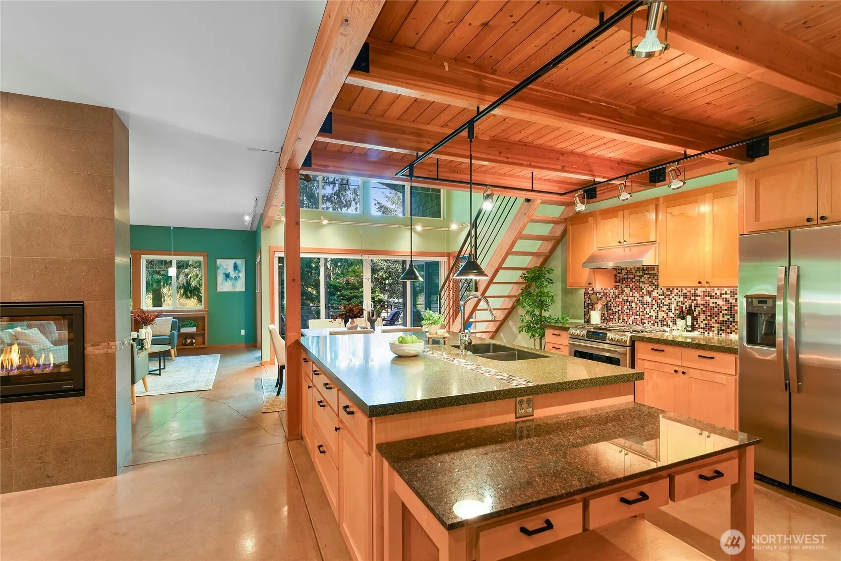 This is a one-of-a-kind, unique and functional, Scandinavian influenced, architecturally designed home on a fenced and private lot. The main floor includes the primary bedroom, full bath, heated concrete floors, an open floorplan with kitchen, living room, dining room, office space, loft, deck, utility/mudroom and heated garage. The partially finished daylight basement is full of potential with sliding glass doors to the patio and back yard, a fully finished 2nd bedroom and ¾ bath wired for Sauna, open area with 220v outlets for optional shop area, plus, plumbed & wired for 2nd kitchen with plenty of extra space for a third bedroom and filling out the current 3-bedroom Septic System. All this and many other functional features in a classic and natural Pacific Northwest wooded setting. Nearby public beach access, trails, commuter bus route, and neighborhood services center. New roof in 2021. Leaf Filter system in 2025. Propane fireplace and kitchen stove. Cedar shingles and paneled siding. Cute Garden shed. Generator, refrigerator, and freezer in garage are included in sale. A must see, so call your broker today.
