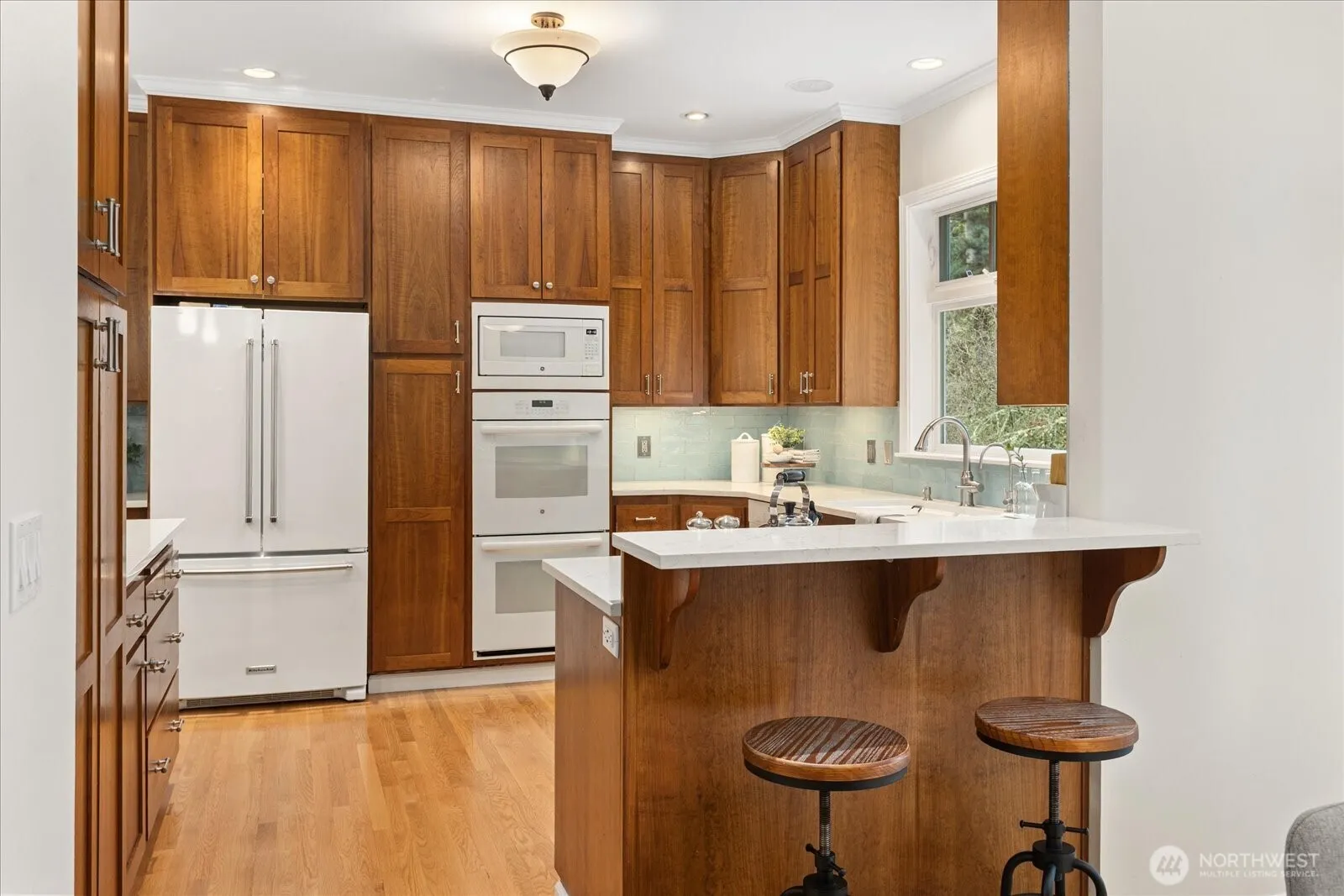 Bordering Eagle Landing Park, this private sanctuary offers an exceptional connection to nature and effortless indoor-outdoor living. The beautifully landscaped grounds feature mature trees, lush planting and garden beds, expansive lawn, and generous patio spaces—all opening to protected parkland with trails and sweeping views. Inside, the light-filled main level captures serene vistas from nearly every room. Rich wood floors lead to a bright kitchen with quartz counters and timeless shaker cabinetry. The inviting living room is designed for gathering, with vaulted ceilings, built-ins, a cozy stone fireplace, and picture window overlooking the tranquil backyard. Two dining areas provide flexibility for both holiday entertaining and everyday living. The bedroom wing includes a spacious primary suite with a walk-in closet and ¾ bath, plus two additional bedrooms, full bath, and powder room. Each bedroom enjoys views of the backyard, adjoining park, and seasonal glimpses of Puget Sound. The lower level offers a warm and welcoming family room, fourth bedroom, utility room, powder room, abundant storage, attached 2-car garage, and ample off-street parking. Great walking neighborhood with proximity to Lake Burien, Seahurst Park, and all that downtown Burien has to offer!