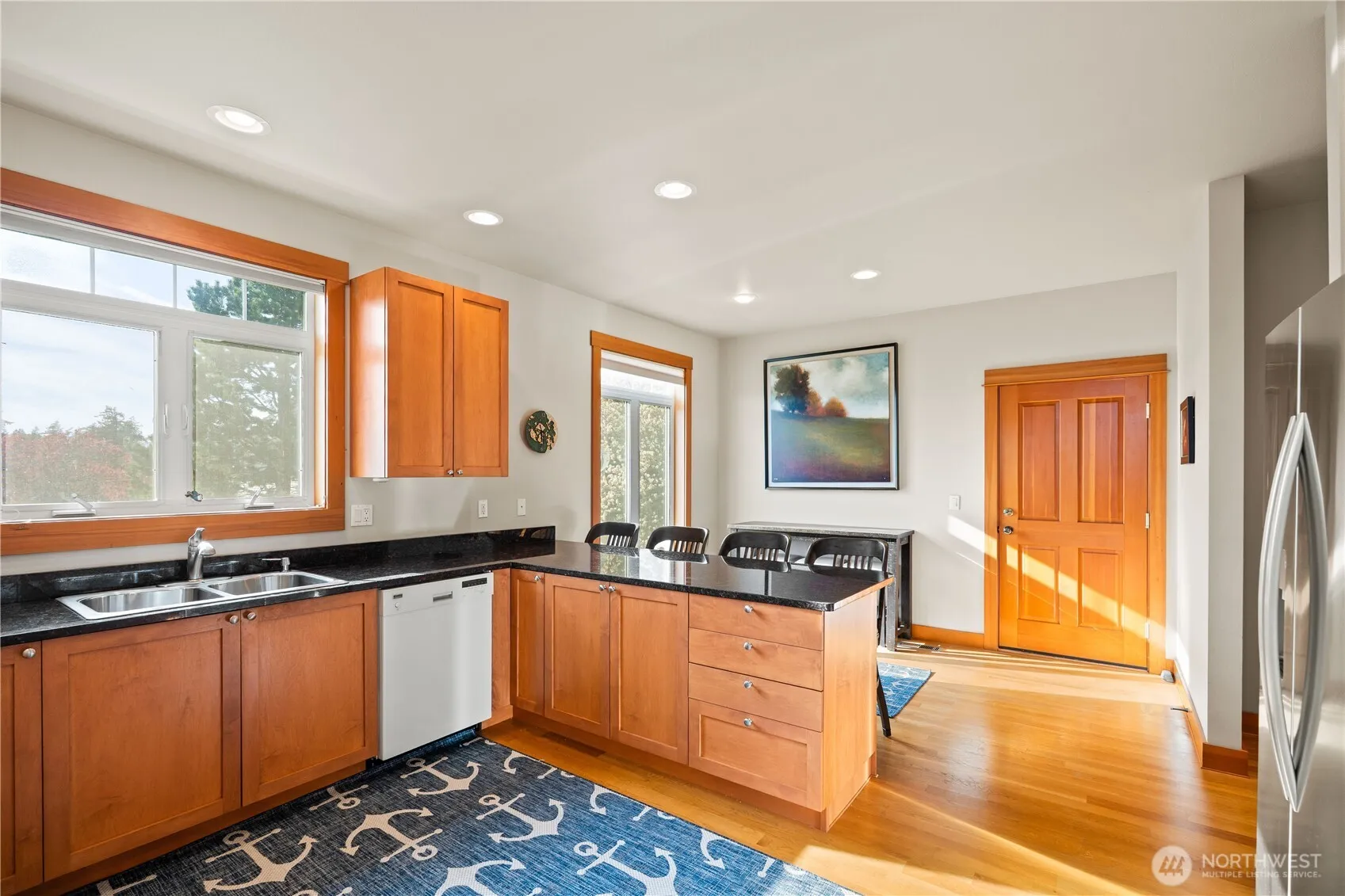 Tucked within the Harbor Hill HOA, this welcoming condo blends comfort, natural light, and an unbeatable location. Vaulted ceilings and large windows flood the home with sunlight, creating a bright, open atmosphere throughout. Generous storage has been thoughtfully incorporated, offering both function and ease for everyday living. The upper-level floor plan flows seamlessly from kitchen to dining to living, ideal for both relaxing and entertaining. Beautiful wood floors with inlaid detailing add warmth and character, while the vaulted ceiling enhances the sense of space. Two well-sized bedrooms each enjoy full bathrooms, providing comfort and privacy. The primary suite opens to a patio—an inviting spot to enjoy a quiet morning. Just a short stroll to the shops, dining, and waterfront of Friday Harbor this condo is very nicely located. Whether as a full-time residence, weekend getaway, or easy lock-and-leave home, it offers a great combination of peacefulness and convenience.