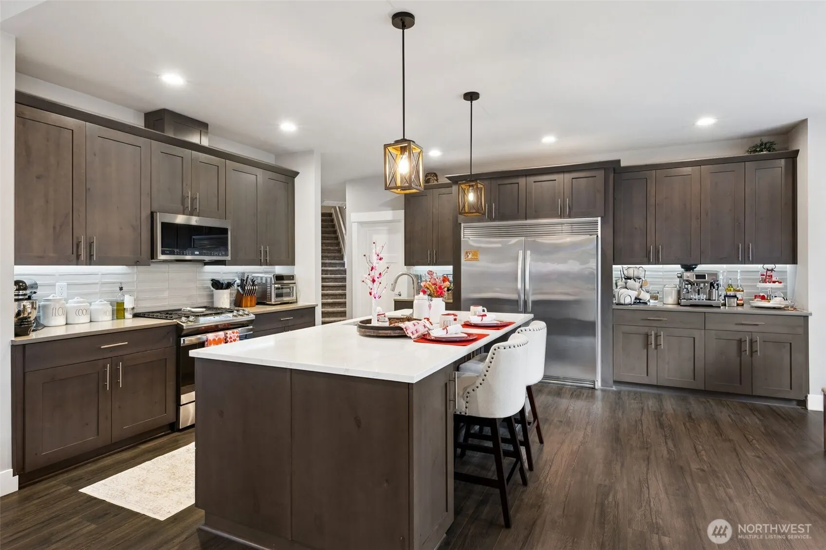 Private community • 3,146 sq ft • 3 beds • 3 baths • Eatonville Beautifully designed single-level residence nestled in a quiet, private community on Mountain Crest Lane, offering over 3,146 sq ft of thoughtfully appointed living space. This home blends a functional layout with designer touches, creating flexible spaces that are ideal for everyday living, entertaining, and multigenerational comfort. Large rooms include a soaring great room with a statement stone fireplace and built-in shelving, opening to the outdoors for seamless indoor-outdoor living. Chef-inspired kitchen features quartz countertops, extensive custom cabinetry, and high-end appliance accommodations, including oversized refrigerator space and ample prep areas. Three spacious bedrooms include a private junior suite and a generous primary retreat with dual walk-in closets and a luxury 5-piece en-suite bathroom with a jetted rain shower, an elegant soaking tub, and a dual vanity. Additional rooms, a bonus/game room, and a home office supporting versatile lifestyles and work-from-home needs. Outdoor living is enhanced by glass doors that lead to a covered veranda with a second fireplace and extended patio, perfect for year-round enjoyment. A fully finished, gorgeous 3-car garage and a large lot with manageable landscaping. Located close to all amenities, community parks, schools, and outdoor recreation options. A refined residence in a desirable setting designed for comfort and style. Includes virtual tour.