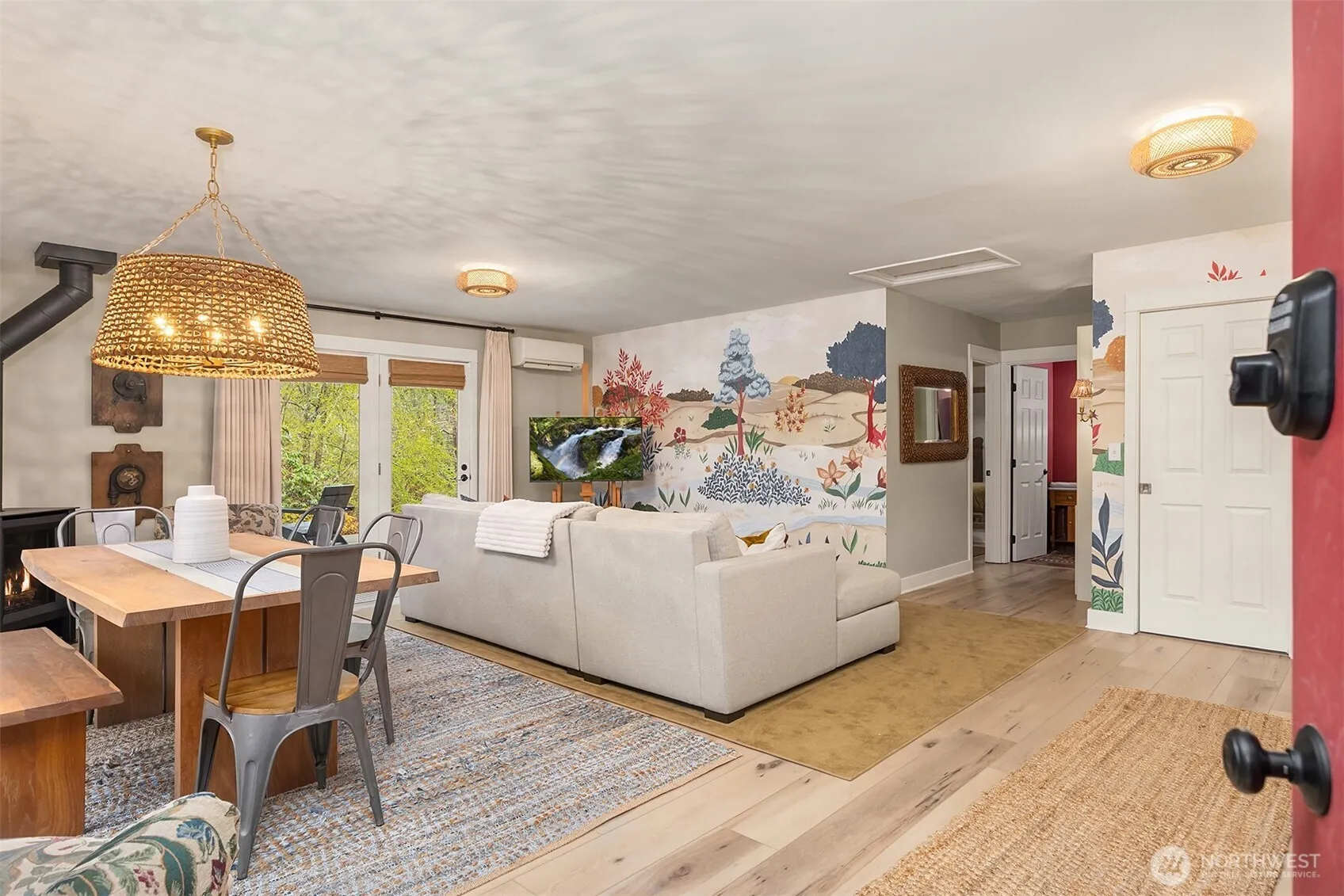 Nestled on 1.23 acres of peaceful, woodsy surroundings, this charming garden cottage-style home offers a rare blend of character and comfort. High ceilings and an open-concept living, dining, and kitchen area create an airy, inviting atmosphere, while a cozy propane stove adds warmth and ambiance. The home is filled with personality, showcasing eclectic yet tasteful finishes throughout. The kitchen shines with stainless Bosch and Samsung appliances, ample cabinetry, and a unique combination of subway tile and wood panel backsplash. Step outside to enjoy beautifully curated gardens, complete with a trellis and winding pathways, or relax on one of two decks—one opening through French doors to a serene patio overlooking native landscaping. The main level features a bedroom with adjacent full bath and tiled shower, while upstairs, the primary suite offers a thoughtful layout, full ensuite bath, and walk-in closet. Located just across the street from shoreline access and recreation at Fay Bainbridge Park, this home is a tranquil retreat with everyday convenience in a truly special setting.
