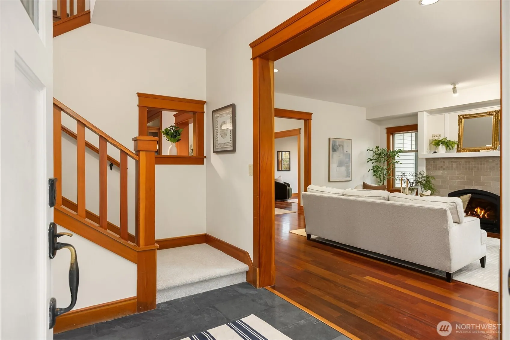 Rolling Bay gem! This modern bungalow blends timeless Arts & Crafts charm with a peaceful corner-lot setting. The 4 bedroom and 2.5 bathroom layout features a main-level primary suite with a five-piece bath and walk-in closet. Rich wood trim and thoughtful finishes run throughout. Unwind in the garden-facing living room with a cozy gas fireplace, or gather in the spacious kitchen with a built-in bench nook and plenty of room to entertain. The open dining area flows into a bright office with French doors. Upstairs offers three bedrooms, a full bath, and a versatile open family room. Enjoy sunsets from the covered front patio or host guests on the large back deck overlooking the fully fenced yard. A generous two-car garage and extra driveway parking provide convenience. Built in 2004 by Sandy Beach Holdings, this home features the sought-after Hawthorn floorplan by Christian Gladu. Ideally located with easy access to Rolling Bay amenities, Manitou Beach, and the ferry for commuting.