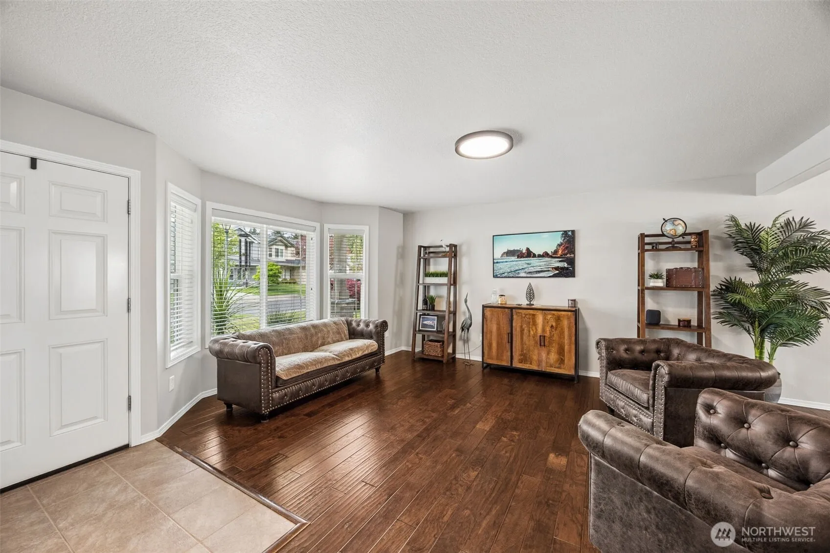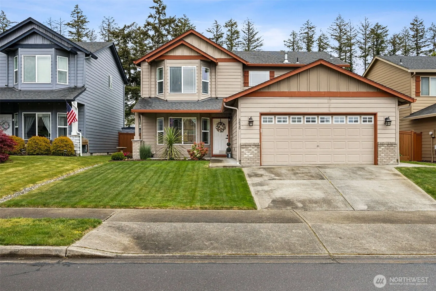Welcome to this beautifully upgraded former model home in the sought-after Meridian Campus at Hawks Prairie! Four spacious bedrooms with 2220 Square feet of space. Enjoy stunning engineered hardwood flooring throughout both levels, adding warmth and elegance to every room. The vaulted stairway with open rail accents creates a spacious feel. The main floor offers a versatile formal living space alongside a dining area or home office—perfect for today’s lifestyle. The kitchen is both stylish and functional, featuring tile flooring, rich cherry cabinetry, stainless steel appliances, and a breakfast bar that opens to a cozy family room with a gas fireplace. Upstairs, all four bedrooms provide comfort and privacy, including a spacious primary suite with vaulted ceilings, a luxurious 5-piece bath with soaking tub, and a walk-in closet. Step outside to a fully fenced backyard with a patio for relaxing or entertaining. An irrigation system covers your front and back yard space for convenience with two raised garden beds. Stay cool all summer with central A/C. 2-car attached garage with laundry/mud room. Conveniently located near I-5, Tolmie State Park, Hawks Prairie shopping and dining, pickleball courts, and just 15 minutes to JBLM’s main gate. This home truly has it all!
