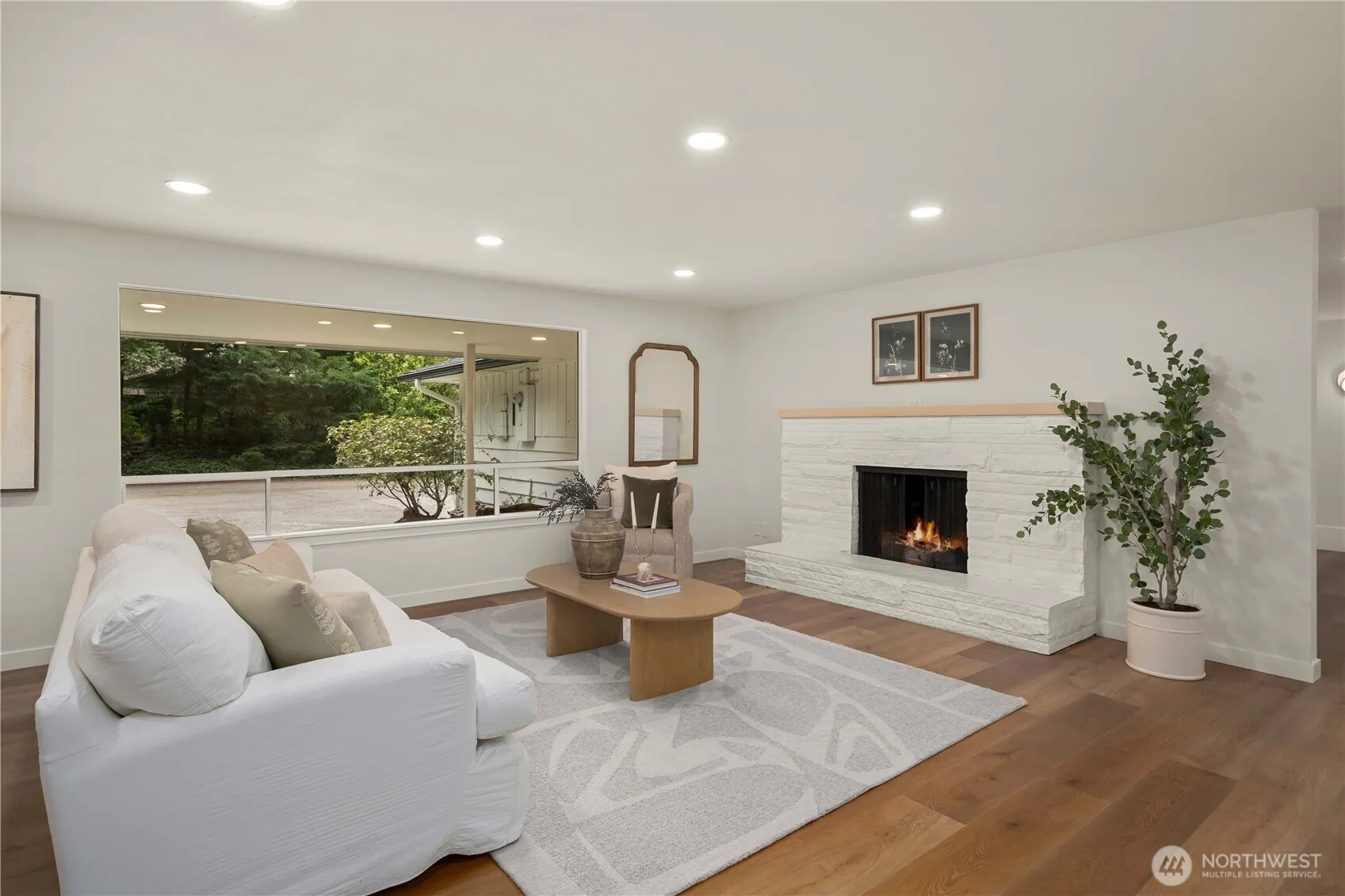 Fully renovated rambler nestled in a peaceful, wooded setting. This home features a new roof, gutters, fresh interior & exterior paint & high-end upgrades throughout. Step into the formal living room showcasing a stunning brick-surround fireplace & expansive windows that fill the space with natural light. The open-concept layout offers seamless sight lines into the spacious kitchen, complete with a center island with additional storage, new stainless steel appliances & a beautiful tile backsplash. The formal dining room features a second fireplace & a sliding glass door leading to the back patio—perfect for indoor-outdoor entertaining. Just steps down from the dining area, a generous family room provides versatile additional living space. The utility/mudroom includes a sink, closet for extra storage & direct access to the backyard. Bedrooms feature original built-ins, adding charm & functional storage. The primary suite offers a spa-like en-suite bath with a large vanity and an oversized walk-in shower adorned with elegant tile work. Outside, enjoy a park-like backyard with mature trees, manicured landscaping, a picnic area, and a concrete pathway leading to the detached two-car garage, which provides ample parking and storage. Situated on just over half an acre, this secluded property offers a tranquil, forest-like atmosphere while remaining just minutes from local amenities and freeway access. Potential opportunity to purchase the adjacent lot for added space or investment.