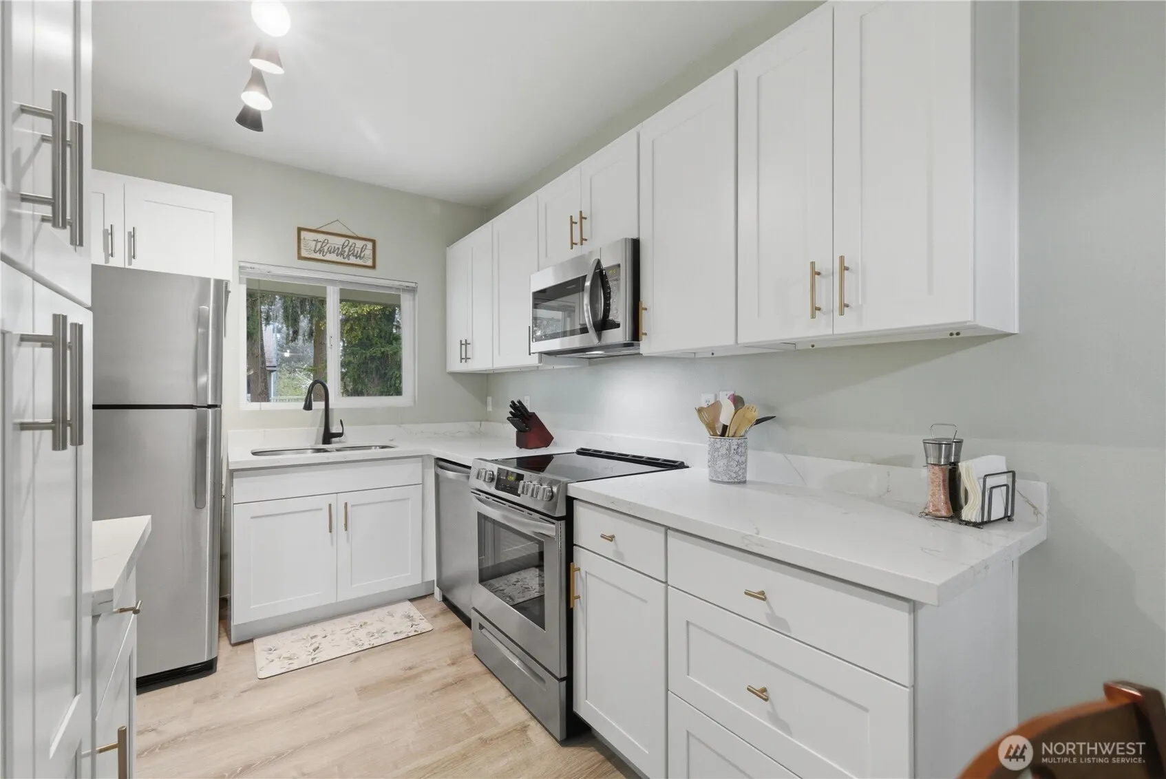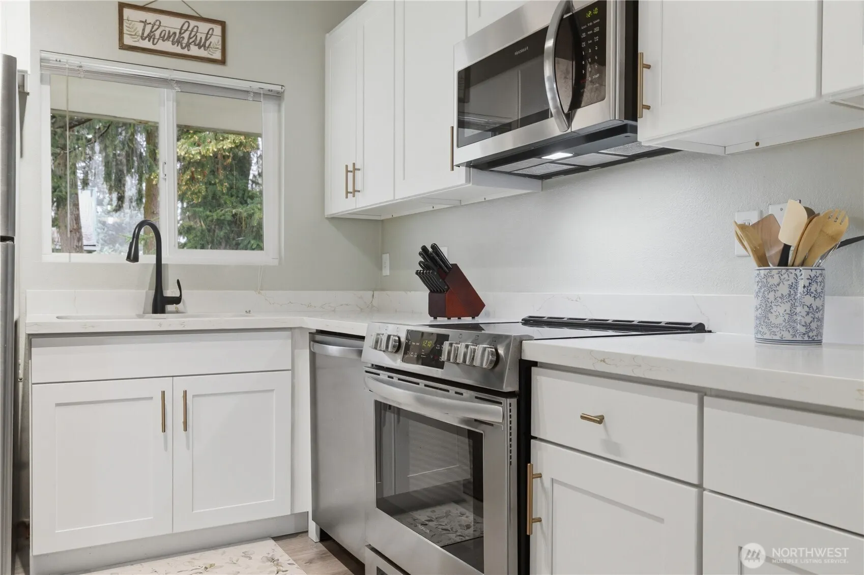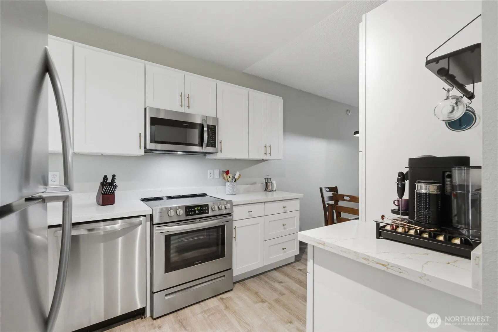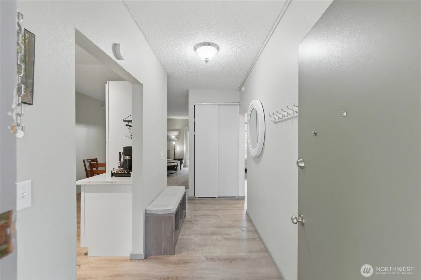 Beautifully updated condo in highly desirable location! 4 minutes to light rail. Near Alderwood Mall, Costco, bus lines, highways, much more shopping (Trader Joes 3 minutes away) and loads of restaurants. Kitchen with new cabinets, countertops, pantry, coffee bar, new appliances. Bath with new cabinetry, sink, faucet. New lighting, newer flooring. Top floor corner unit – no one above you or to 1 side. Lots of guest parking in addition to assigned space. Elevator provides convenience for daily use and moving. Outdoor pool! Lovely center courtyard provides year-round natural beauty out the window. Nice deck off sliders. Handy utility room in home with storage, along with separate storage unit. Scriber Lake close in one direction and Interurban trails the other! Excellent Edmonds schools. All this plus you receive a free home warranty!