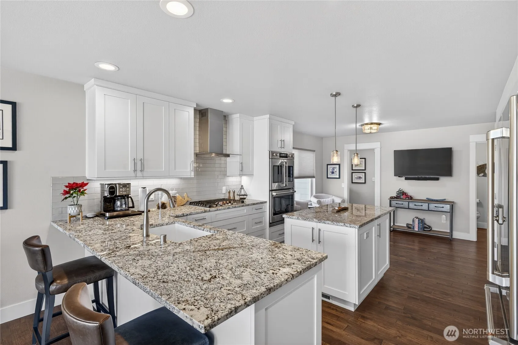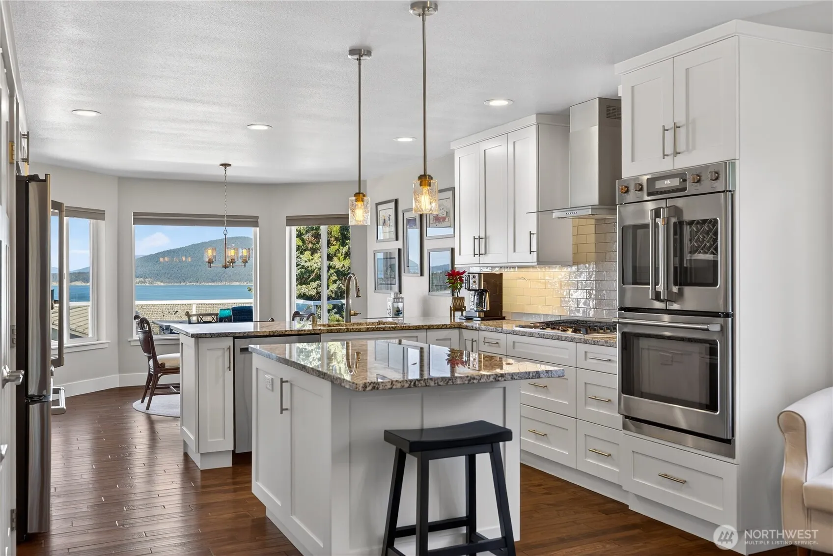 Perched on a beautifully landscaped corner lot, this light-filled home captures sweeping water, island, and mountain views that define the Pacific Northwest lifestyle. Step inside to an inviting open-concept layout where rich hardwood floors, vaulted ceilings, and a stunning stone fireplace create a warm, elevated living space designed for both everyday comfort and effortless entertaining. The chef-inspired kitchen features expansive granite countertops, crisp white cabinetry, stainless steel appliances, and a generous island that flows seamlessly into the dining and living areas. Large windows frame breathtaking views, bringing natural beauty indoors. Unwind in the spa-like primary suite with a luxurious walk-in tile shower and serene soaking tub, thoughtfully designed for relaxation. Outdoor living shines with an expansive view deck—perfect for morning coffee or sunset gatherings—overlooking the water and surrounding neighborhood. The meticulously maintained grounds offer striking curb appeal with curated landscaping, stone pathways, and vibrant plantings. A spacious garage and additional parking provide flexibility, while nearby community amenities, including sports courts, enhance an active lifestyle. This is more than a home—it’s a front-row seat to the lifestyle you’ve been waiting for.
