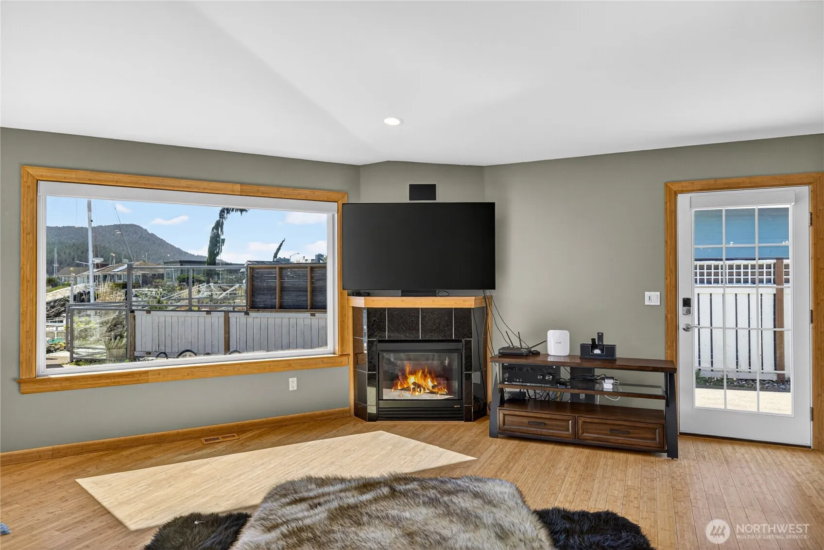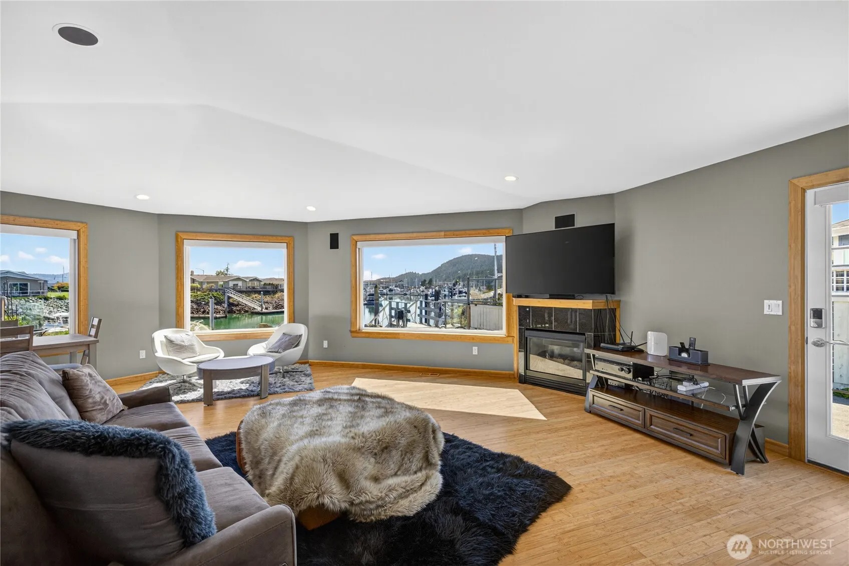 Experience unforgettable sunsets from this stunning luxury waterfront home with access to a 47’ shared dock complete with power and water. Take in sweeping panoramic views from the expansive great room featuring vaulted ceilings, rich bamboo flooring, and a cozy gas-tiled fireplace. The gourmet kitchen is designed to impress with granite countertops, stainless steel appliances, and a spacious breakfast bar—perfect for gathering and entertaining. Retreat to the luxurious primary suite offering a double-sided fireplace, walk-in closet with built-in vanity, private sitting area with outdoor access, and a spa-inspired ensuite with jetted tub and tiled walk-in shower. Step outside to your private back patio featuring an in-ground hot tub and generous space for outdoor dining, relaxing, and soaking in the waterfront lifestyle. Additional highlights include convenient RV parking and access to Skyline amenities, including clubhouses, sports courts, and more. A rare opportunity to enjoy comfort, views, and lifestyle all in one exceptional property.