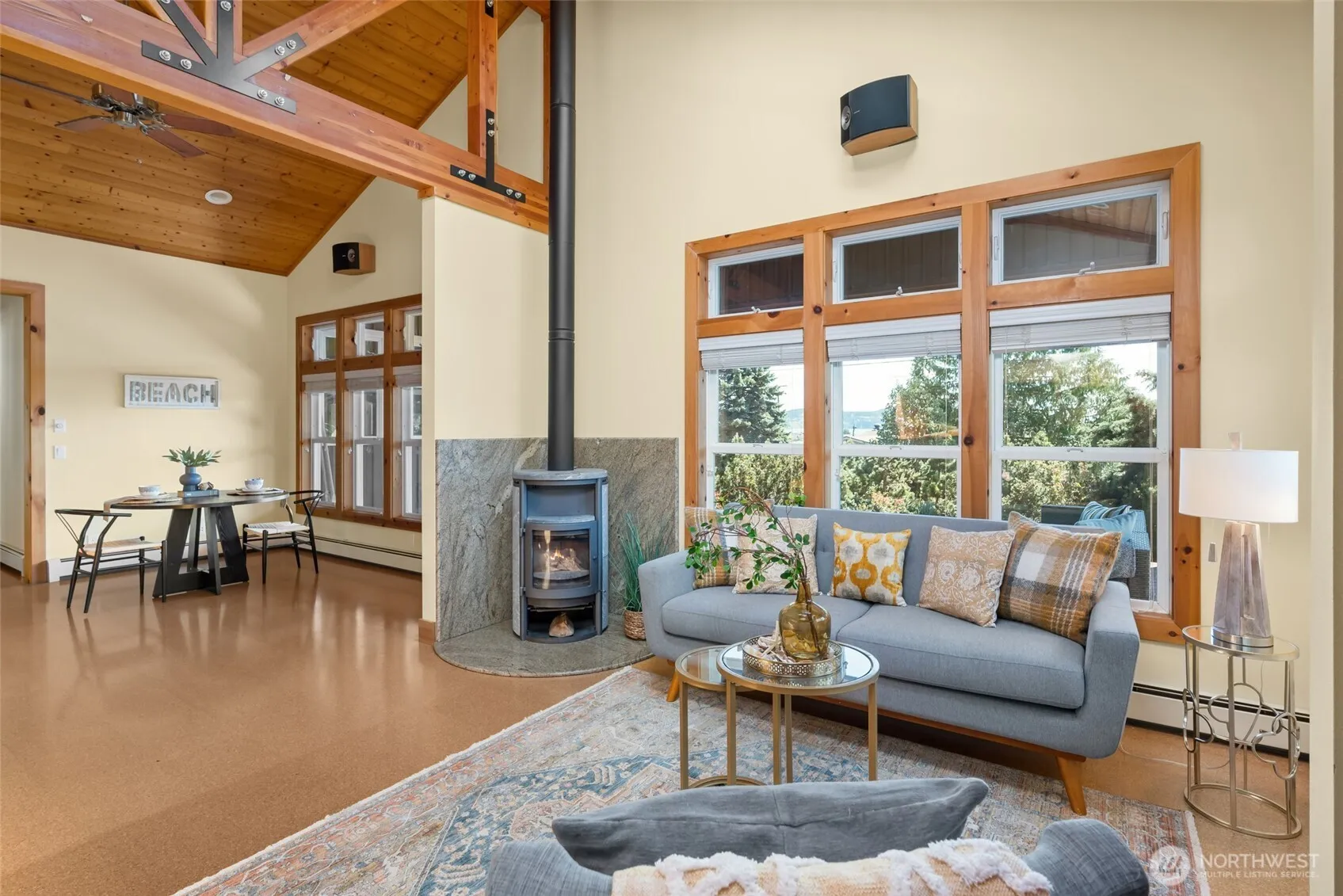 Set on an expansive ultra PRIVATE corner lot with partial water views of Burrows Bay, this charming custom built single level home offers a bright & airy floorplan. Sunlight fills the south-facing living room and kitchen accented with beautiful exposed beams, vaulted soaring tongue & groove wood ceilings, custom built-in cabinetry, & a cozy soap stone wood burning fireplace. The open design creates an inviting space complemented with an expansive outdoor covered private deck perfect for year-round entertaining. Enjoy meal prep in the spacious kitchen with granite island eating bar and abundant pantry storage. With ample room for your boat or RV and a massive garage with shop space, this home is the perfect base for your Pacific Northwest adventures. Located in the desirable Skyline community, with access to beaches, tennis/pickleball courts, clubhouse, and marina. Just minutes from Washington Park public boat launch at Sunset Beach, playground & scenic hiking trails. This home offers the perfect setting for an active outdoor lifestyle where every day feels like a peaceful coastal getaway!