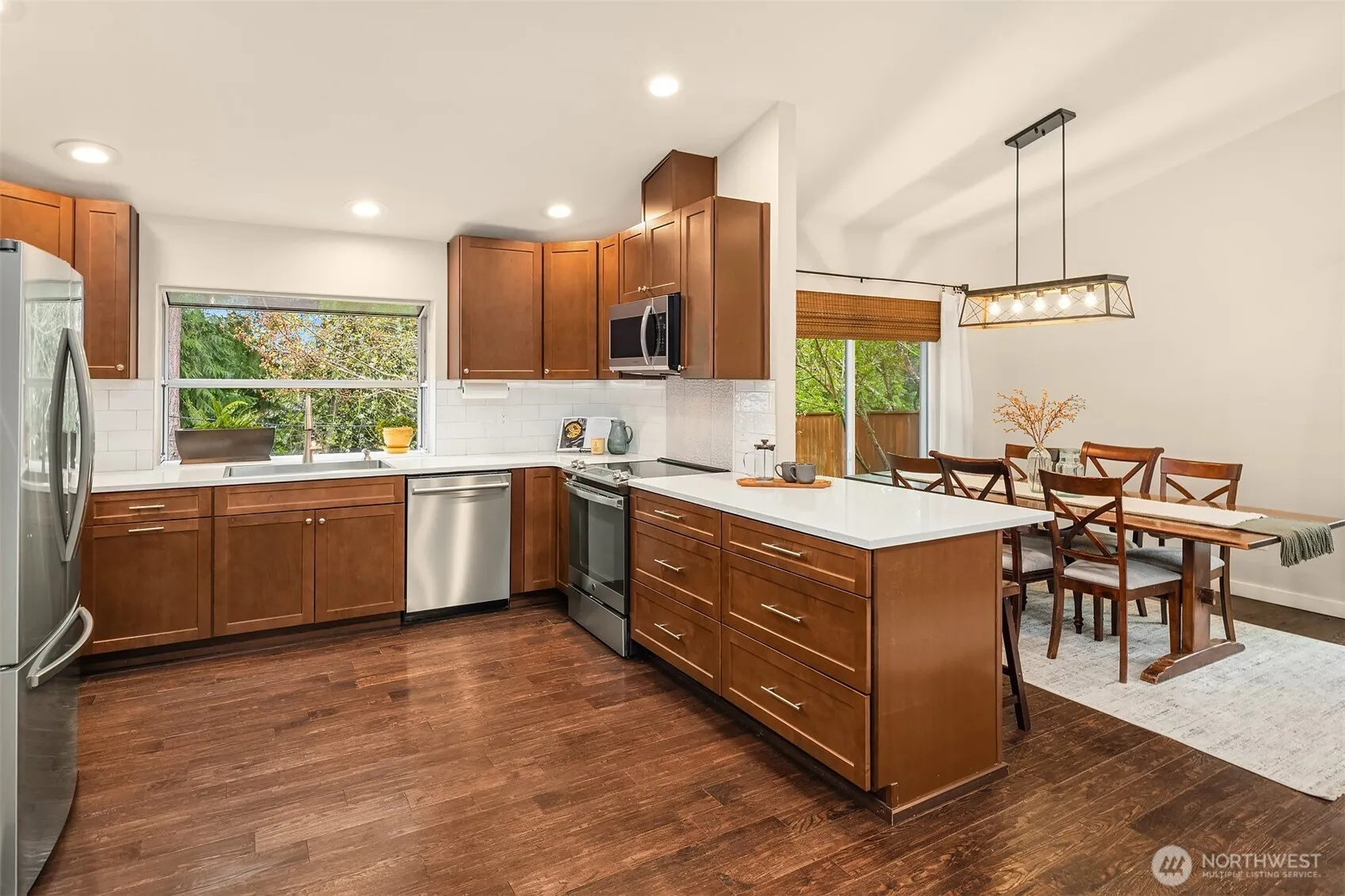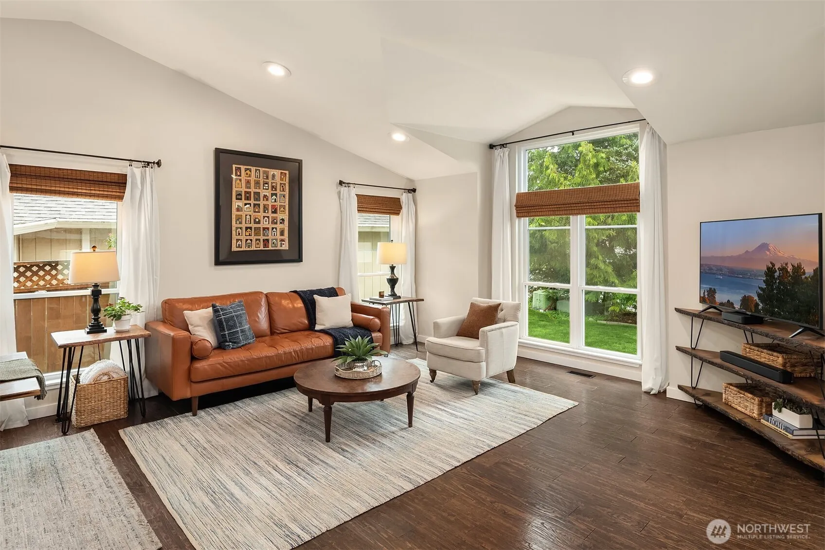 Impeccably renovated tri-level home in the coveted Silver Firs community, backing to a lush, private greenbelt. This light-filled residence has undergone an extensive transformation, blending timeless aesthetics with essential peace-of-mind updates. The main level welcomes you with vaulted ceilings and an open-concept kitchen and dining area featuring premium quartz countertops, custom cabinetry, and rich hardwood floors. New high-efficiency vinyl windows throughout invite an abundance of natural light into every room.The highly functional floor plan ensures comfort for all, with all three bedrooms on the upper level, including a primary suite with a private ensuite bath. The lower level offers a spacious second family room anchored by a cozy fireplace—perfect for a media room or play space. Enjoy home system updates: new roof & skylights, updated attic and crawl space insulation, and a new water heater.Step outside to your own private oasis: an expansive fully-fenced backyard with thoughtful landscaping that opens to a serene greenbelt, offering rare privacy. A spacious 2-car garage, new outdoor shed, and gated side yard boat/trailer parking are ready for your hobbies and toys! Located on a quiet street within a picturesque neighborhood, you are just steps from local parks, walking trail network, playgrounds, and top-rated schools. Enjoy quintessential neighborhood living with easy access to shopping and commuting routes. A turnkey gem in the heart of Silver Firs.