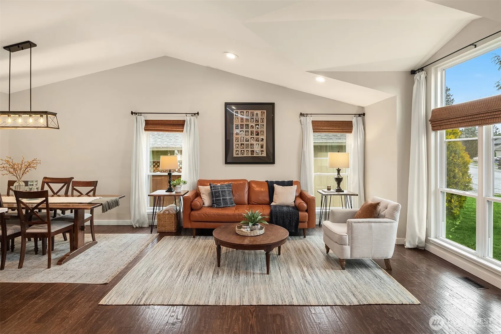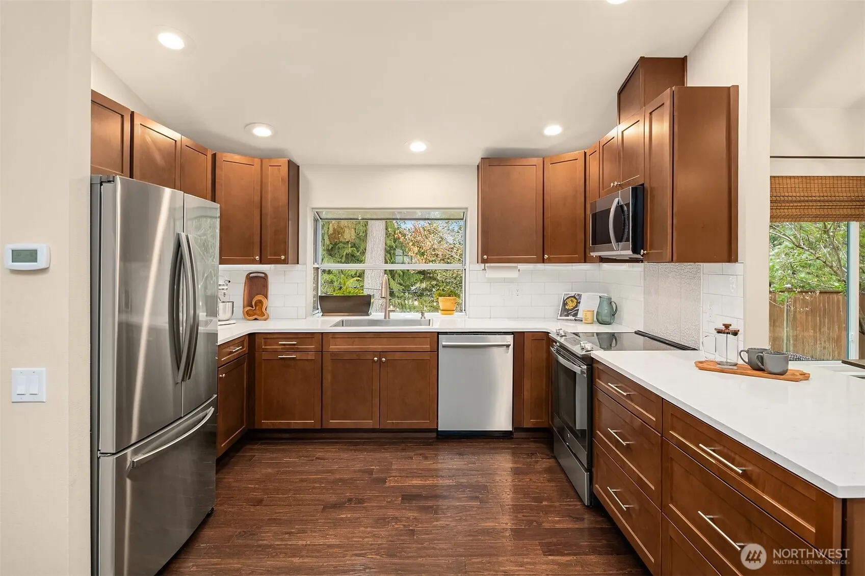 Impeccably renovated tri-level home in the coveted Silver Firs community, backing to a lush, private greenbelt. This light-filled residence has undergone an extensive transformation, blending timeless aesthetics with essential peace-of-mind updates. The main level welcomes you with vaulted ceilings and an open-concept kitchen and dining area featuring premium quartz countertops, custom cabinetry, and rich hardwood floors. New high-efficiency vinyl windows throughout invite an abundance of natural light into every room.The highly functional floor plan ensures comfort for all, with all three bedrooms on the upper level, including a primary suite with a private ensuite bath. The lower level offers a spacious second family room anchored by a cozy fireplace—perfect for a media room or play space. Enjoy home system updates: new roof & skylights, updated attic and crawl space insulation, and a new water heater.Step outside to your own private oasis: an expansive fully-fenced backyard with thoughtful landscaping that opens to a serene greenbelt, offering rare privacy. A spacious 2-car garage, new outdoor shed, and gated side yard boat/trailer parking are ready for your hobbies and toys! Located on a quiet street within a picturesque neighborhood, you are just steps from local parks, walking trail network, playgrounds, and top-rated schools. Enjoy quintessential neighborhood living with easy access to shopping and commuting routes. A turnkey gem in the heart of Silver Firs.