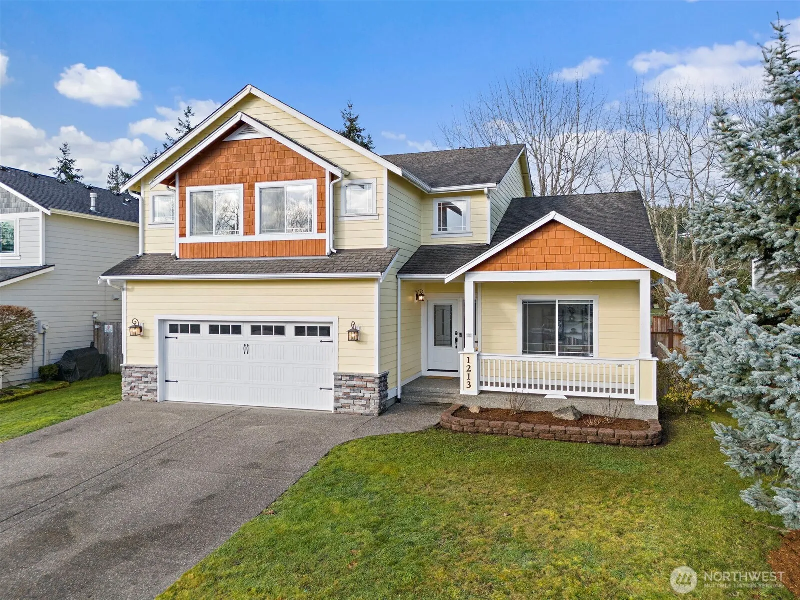 Welcome to Northwest living in the heart of Orting. This impeccably cared for, nearly 2,700 sq ft home situated ideally next to High Cedars Golf Course, offering peaceful fairway views and open green space behind the home. Thoughtfully maintained with custom finishes, this 4-bedroom + den, 2.5-bath home offers a functional and desirable floor plan. The large kitchen features granite slab countertops, custom cabinetry with pull outs, and Acacia hardwood floors that flow throughout the main living areas. Crown molding, wood wrapped windows, and vaulted ceilings add warmth and character rarely found in newer construction. Upstairs, spacious secondary bedrooms provide flexibility, while the primary suite is privately positioned down the hall, creating a quiet retreat. A main floor den makes the perfect home office, guest space, or playroom. Step outside to an entertainment sized deck overlooking the golf course, ideal for BBQs, morning coffee, or evening sunsets. The backyard borders expansive, well maintained green space, along the 5th fairway, a scenic Par 5 at High Cedars. A private gate offers direct access for walks along the golf course and down to the nearby river. Golf course living, updated finishes, flexible space, and an unbeatable Orting location, this home truly captures the best of Pacific Northwest living.
