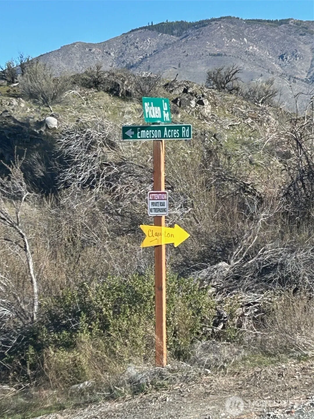 • Directions: Hwy 150 toward Manson. Right on Wapato Lake Rd. Right on Lower Joe Creek Rd. Left onto Emerson Acres Rd. Follow Emerson Acres Rd (4 wheel drive recommend) to sign.
