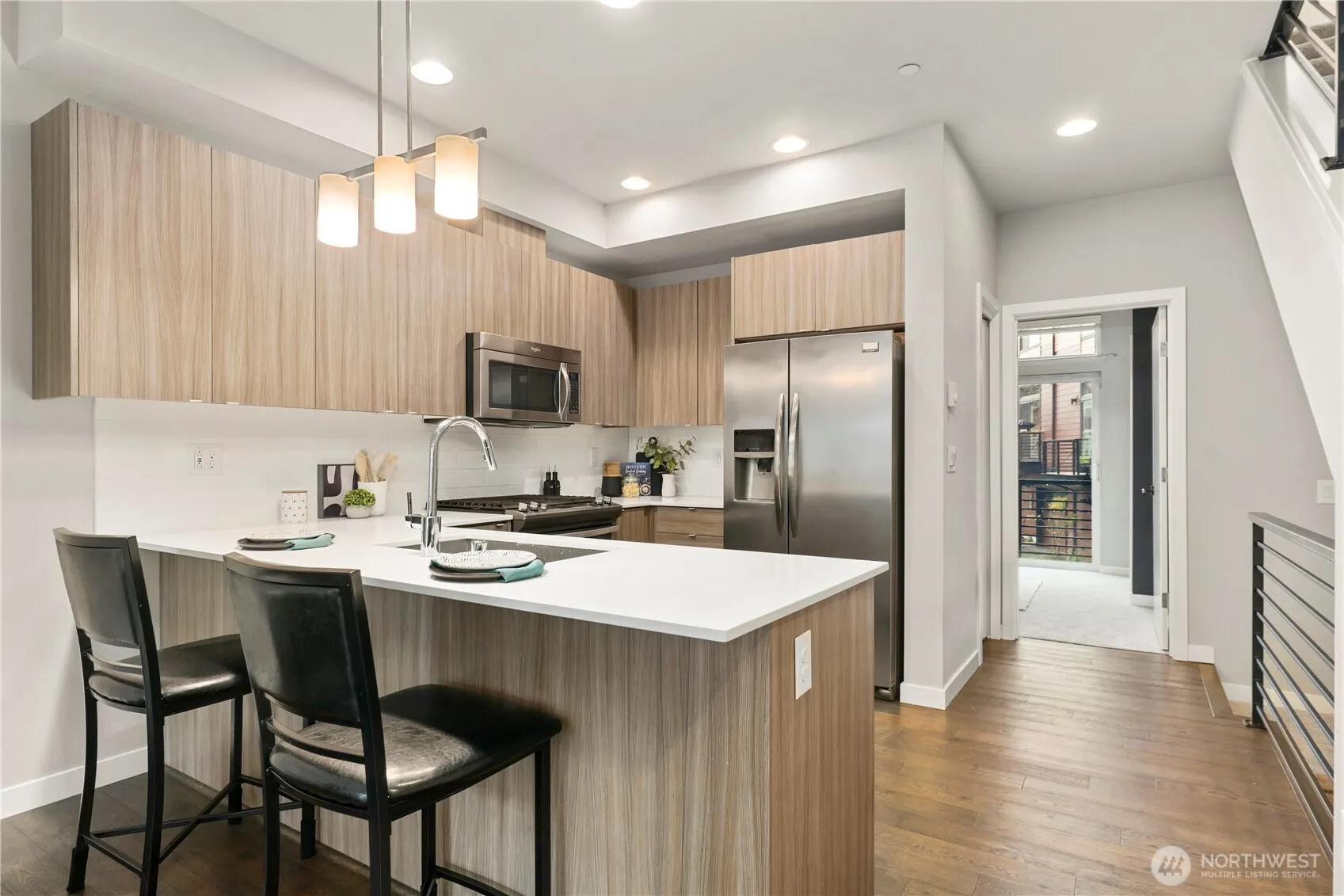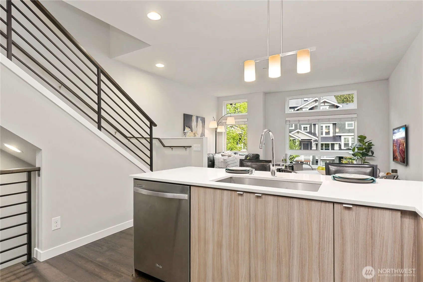 Amazing modern home in the Talus neighborhood. 3 bedrooms/2.5 baths in 1356 square feet of light and bright living space. Main level with hardwood floors. Kitchen with Quartz countertops, gas range and stainless steel appliances. Comfortable living room/great room with lots of sun. Bedroom/den with a 3/4 bath and a deck. Metal stair railings, high ceilings, big windows, 2 inch blinds throughout. Primary bedroom upstairs with vaulted ceilings plenty of closet space and a lovely bathroom. 2nd bedroom with a hallway full bath. Upstairs laundry. 2 car tandem garage, tankless hot water tank, brand new carpet throughout. Talus is surrounded by hundreds of acres of protected forest land, parks, and endless hiking trails to explore. Minutes to I-90 with access to Seattle, Bellevue and all of the outdoor fun close by. An easy walk to downtown Issaquah and all it has to offer. Award Winning Issaquah Schools.
