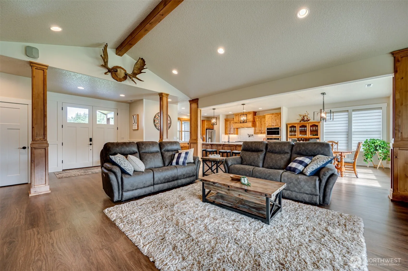 Privately gated and thoughtfully designed, this custom built 2022 home offers a rare combination of quality, functionality, and usable land. Set on a beautiful, private property with a pond, this property includes a huge 40×60 shop with an additional 14′ overhang and paved parking. Inside, you’ll find over 2,800 square feet, all on one-level with timeless, high-end finishes throughout, including knotty alder cabinetry, quartz countertops, built-ins, and a vaulted living space with a propane fireplace. The layout includes 3 bedrooms, including a primary suite and a secondary ensuite, plus a dedicated office or optional 4th bedroom. The primary suite offers a soaking tub, tile shower, and a walk-in closet connected to the laundry room. Enjoy year-round outdoor living with a covered patio, heaters, and high-end retractable shades. A truly hard to find property.