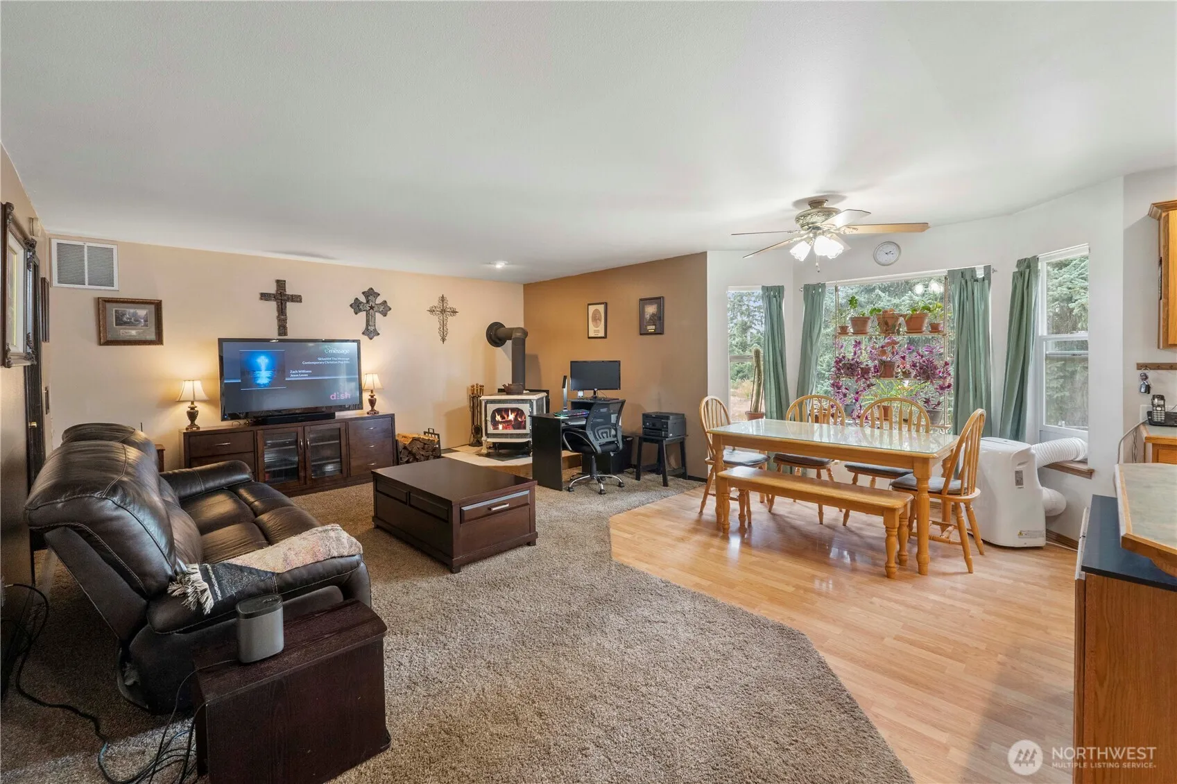 Charming and well-maintained custom 2001 country home on 5+ dry acres at the end of a peaceful cul-de-sac. This spacious 4-bedroom, 2.75-bath home features an open floor plan with a JennAir cooktop island, cozy soapstone wood stove in the family room, and a large bonus room with mini bar. The primary suite includes a luxurious jetted tub and a convenient laundry chute. Outside, enjoy 5 fully fenced acres with 3 covered stalls, 50-ft round pen, and a gated white vinyl entry. Property includes mature marketable timber. Ideal for horse lovers or those seeking country privacy with modern comfort!