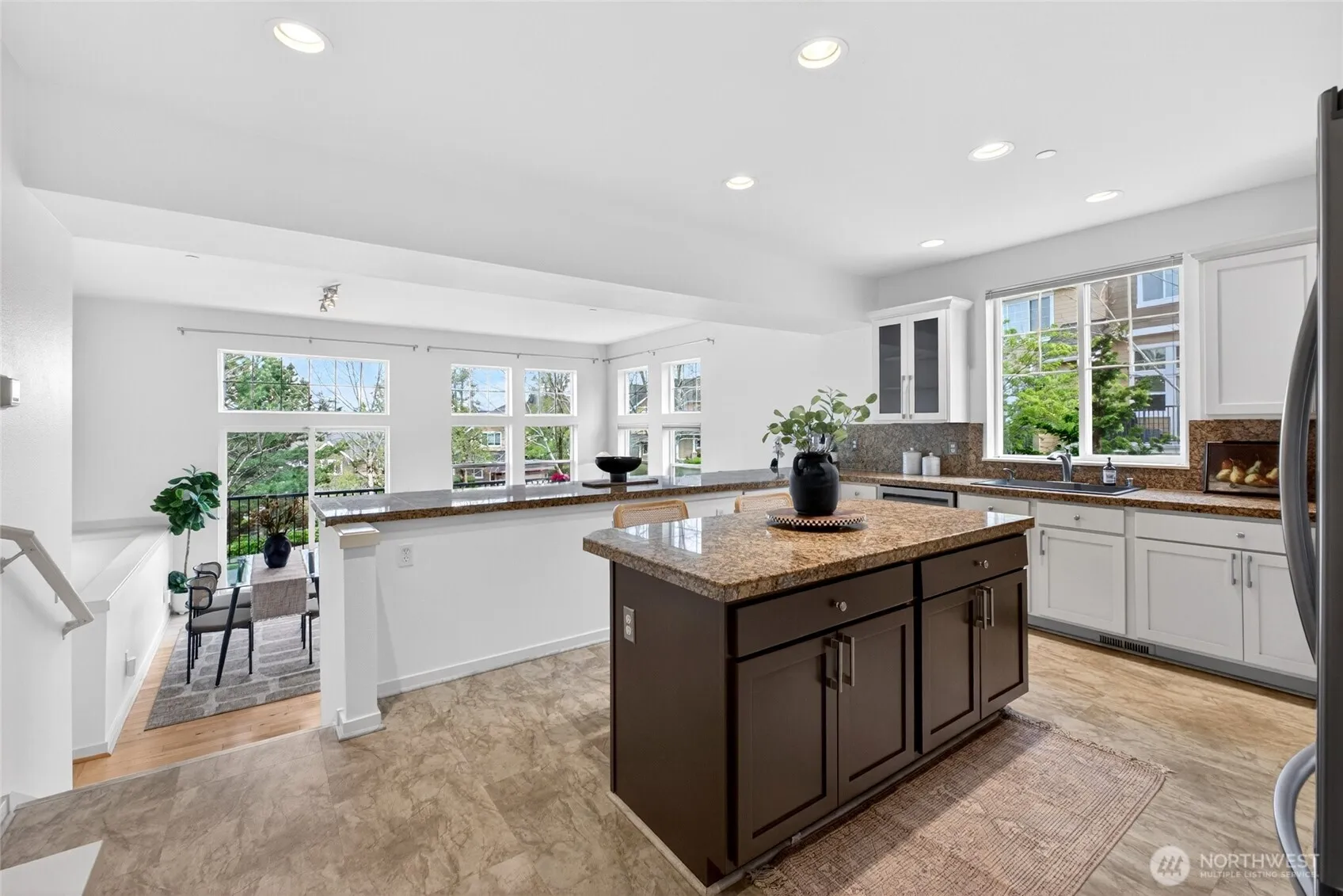 Welcome to Issaquah Higlands living. Spacious & filled with natural light, this corner-unit townhome offers 3 bedrooms, 2.5 baths, and 1,882 sq ft across two thoughtfully designed levels. With no direct neighbor on one side and surrounded by trees, this home enjoys added privacy and a more open feel than most in the community. A welcoming front living room provides flexible space for relaxing, hosting, or a home office. The expansive kitchen features extensive counter space, a large central island, pantry access, & seamless flow into the dining & main living areas, all framed by oversized windows that bring in natural light. A built-in nook offers flexible use for recipes, homework, or a coffee bar, while a powder room completes the main level. The primary suite offers mountain views, a generous layout, and an oversized walk-in closet with a well-appointed bath. Two additional bedrooms are connected by a Jack and Jill bath, with upstairs laundry for added convenience. Enjoy both a front deck and a separate private back deck, ideal for different settings. Fresh interior paint & carpet, a newer furnace, AC upstairs, newer exterior paint, and a newer roof mean all major systems have been updated within the last three years, making this home truly move-in ready. The lower level includes a two-car garage with extra storage, plus abundant parking in front and behind the home. Located just across from the elementary school, with parks, shopping, and restaurants within a half mile.