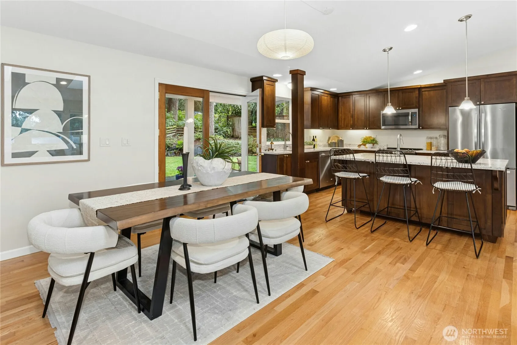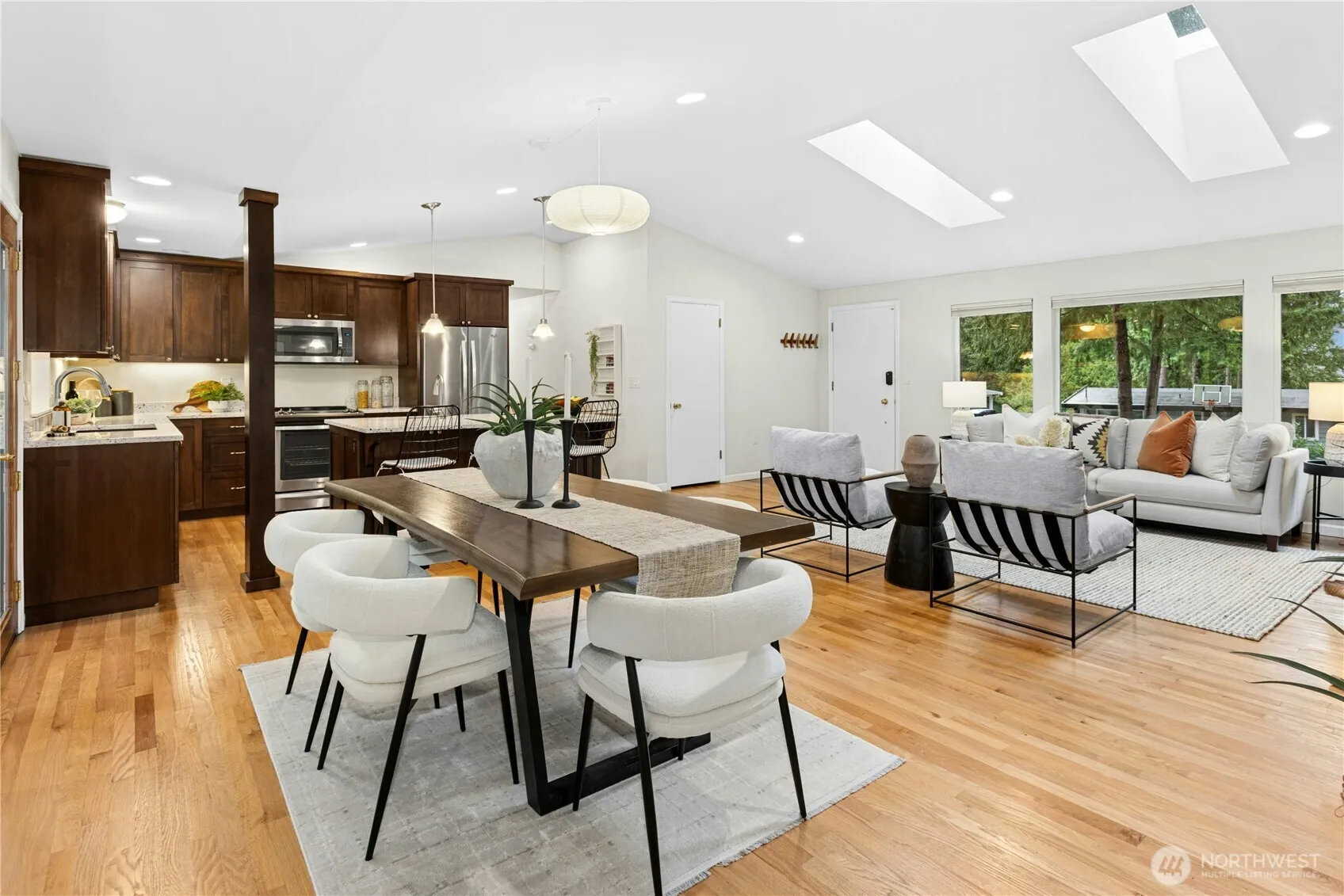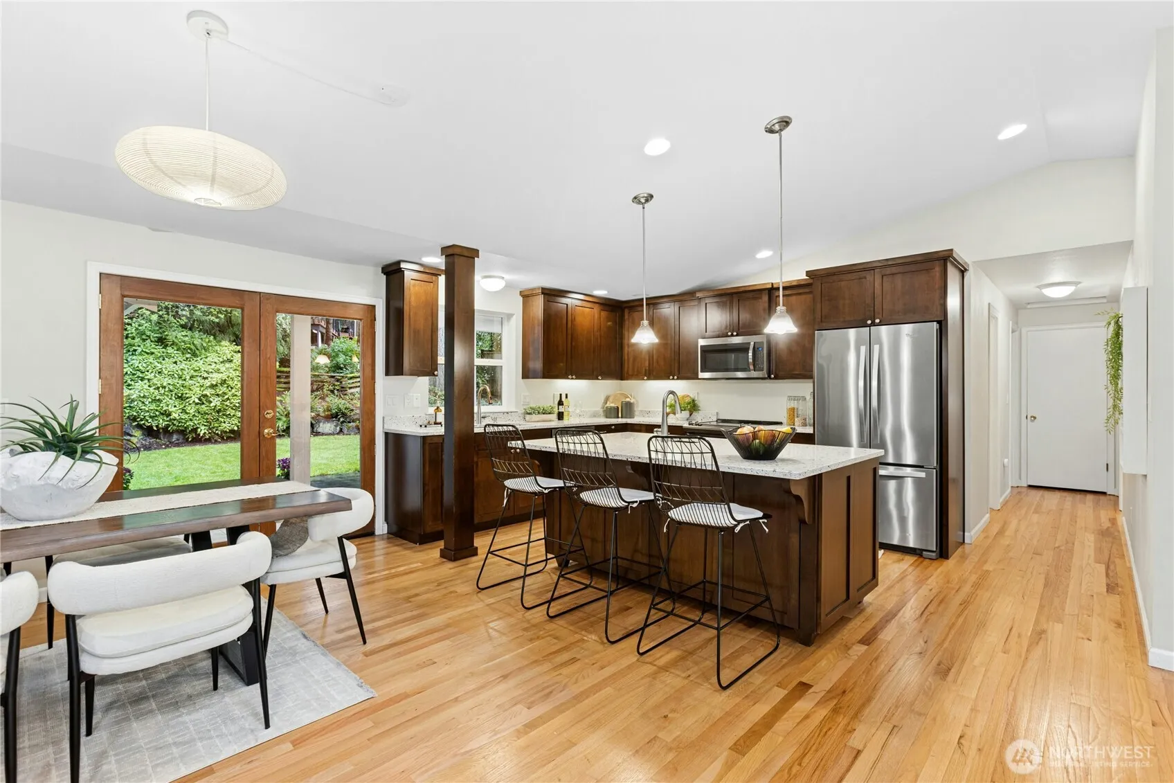 Tucked away on the end of Mt Index Pl, rests this one-of-kind rambler nestled up against a scenic greenbelt with creek below. On nearly half an acre lot offering a rare blend of tranquility, privacy, and refined comfort, this is just a short walk from downtown Issaquah. Vaulted ceilings and skylights bathe the great room in natural light, while French doors open to a serene outdoor sanctuary overlooking a peaceful creek. Rich oak hardwood floors extend throughout the main living spaces, complemented by a thoughtfully updated kitchen with open great-room design. Unwind under the covered patio in your private hot tub, or gather around the cozy wood stove on cooler evenings. Designed for easy living, the home features updated electrical and plumbing (2016), a newer 10 year old roof, and a 3-year-old HVAC system with an energy-efficient electric heat pump for year-round comfort. Located within the award-winning Issaquah School District, this exceptional property offers the perfect balance of nature, seclusion, style, and convenience. Comes with garden space, oversized 2-car garage and ample parking. 2 minute drive or 5-10 minute walk to Historic Olde Town Issaquah for endless events, shops and dining! Live the dream!