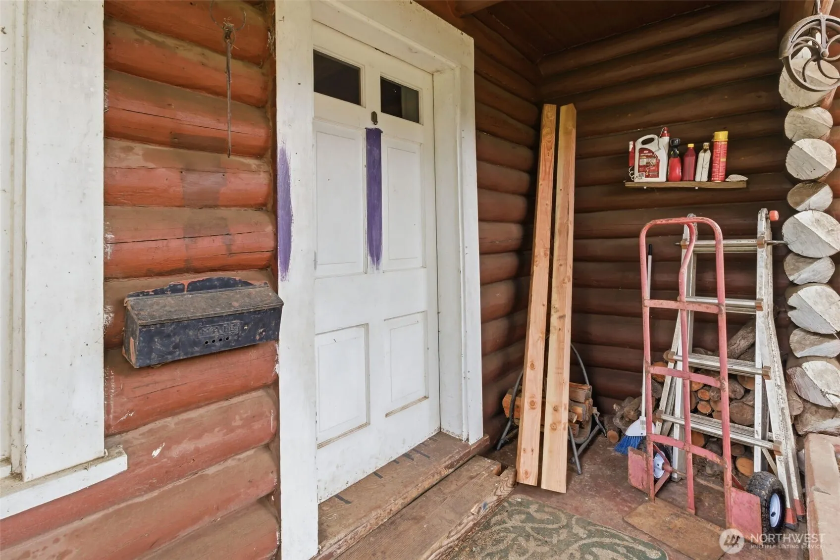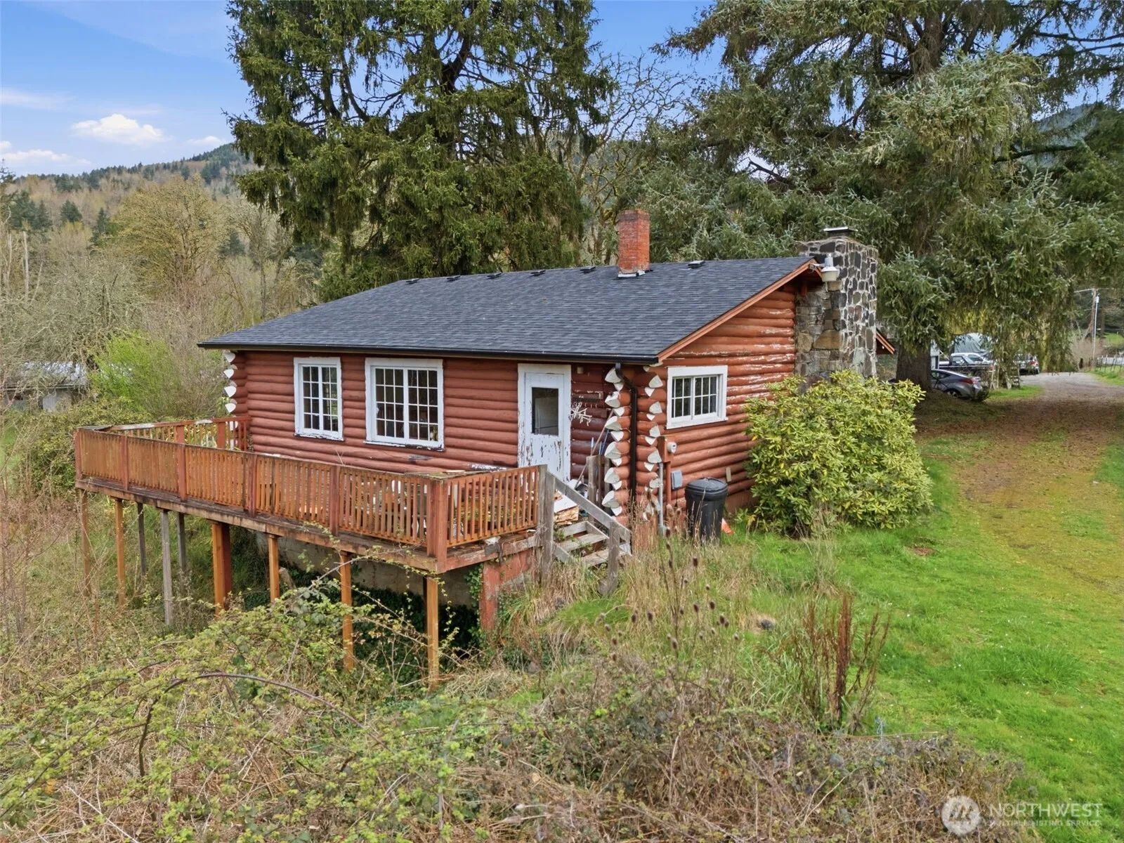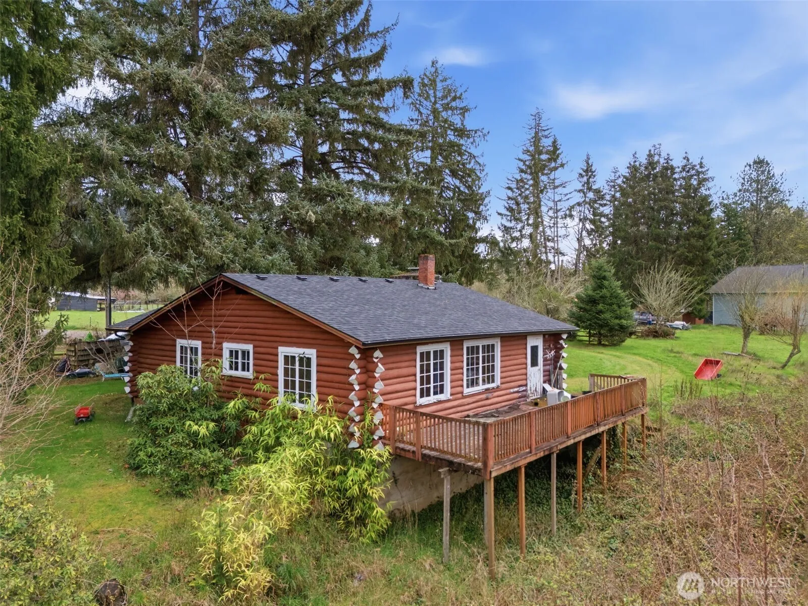 Opportunity awaits on 3.57 acres! This 2-bed, 1-bath log home is ready for your ideas and updates. Home features hardwood floors, kitchen with backyard access, and a dining room. The basement includes laundry and additional space. Property includes a deck, RV hookup, two large outbuildings, and fruit trees—ideal for those looking to create a hobby farm or invest in acreage with potential.