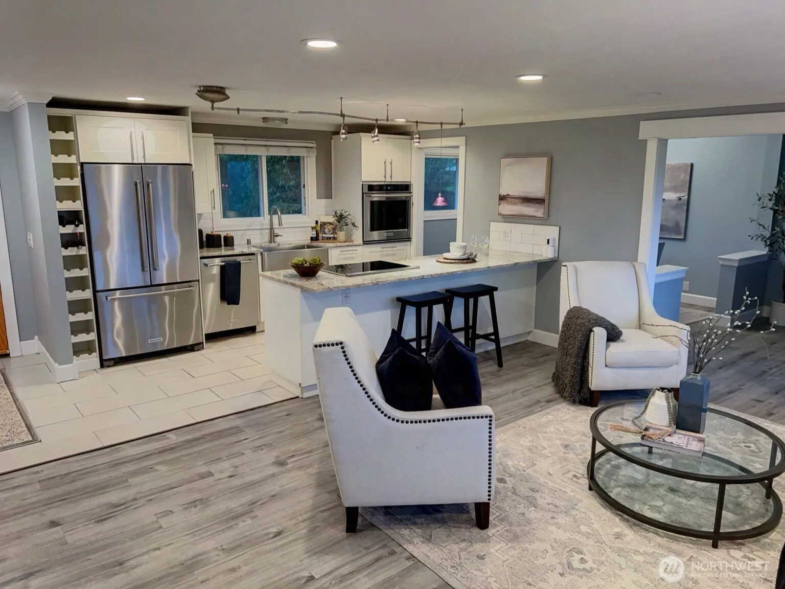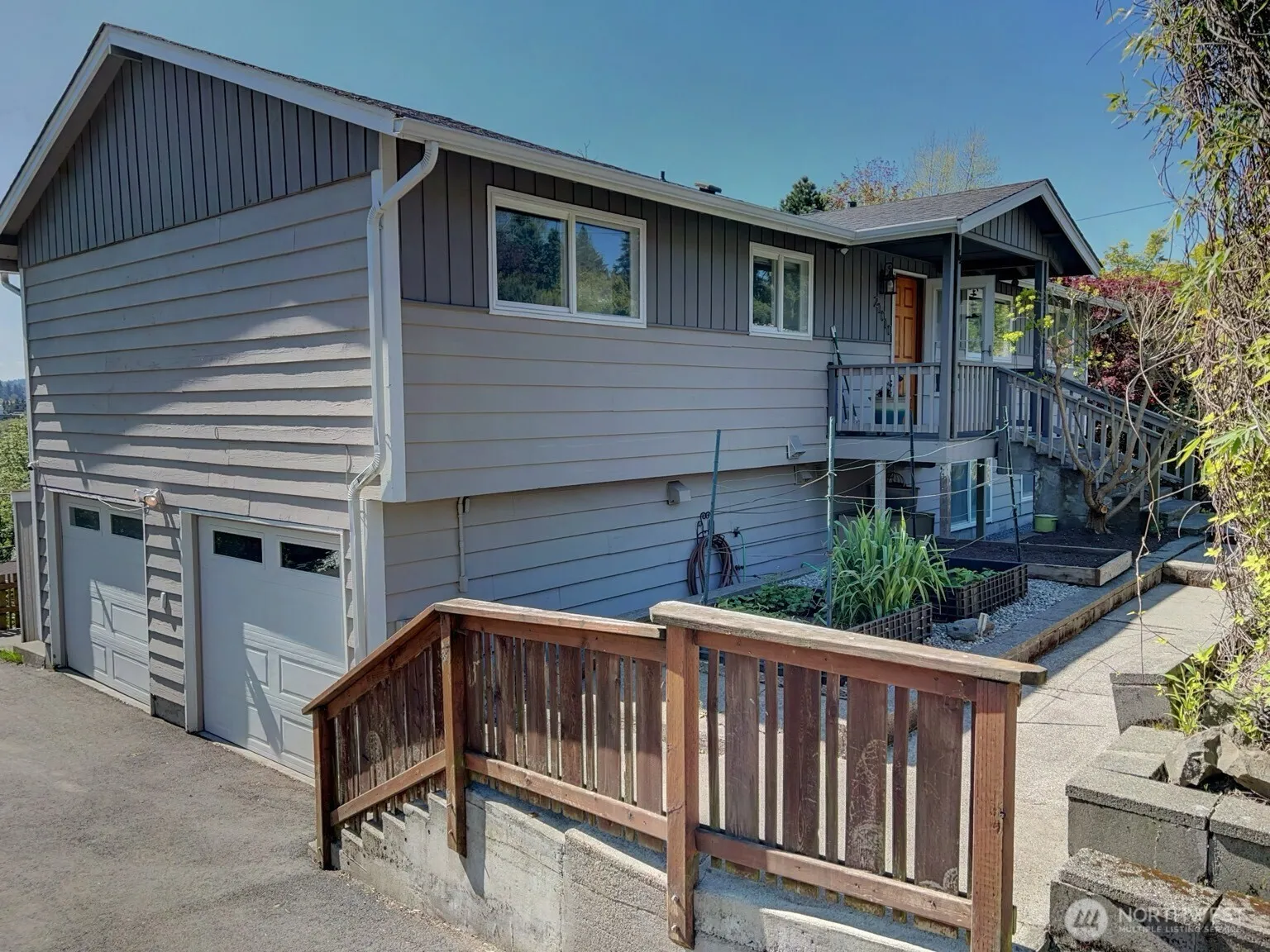 Charming, one-story VIEW home with daylight basement on sought-after North Hill in Des Moines! Main floor features 3 bedrooms, 1 updated bath, an open-concept kitchen and living area with breathtaking Mount Rainier views plus a partial Puget Sound vista and a spacious dining room. The kitchen features quartz countertops, newer stainless steel appliances and a stylish sink. Main level flooring is engineered hardwood. Lower level offers a 2-car garage, 1 additional bedroom, 1 updated bath with large walk-in shower, a relaxing sauna (with a view of Mount Rainier!), office space and a comfortable living space. There is room and plumbing downstairs for a second kitchen – perfect for ADU or MIL setup if desired. Interior has been almost entirely updated over the past 5 years. Updates include newer decks, trim, modernized bathrooms, kitchen and flooring. Just a short drive to the marina, airport and light rail – perfect location, privacy and views!