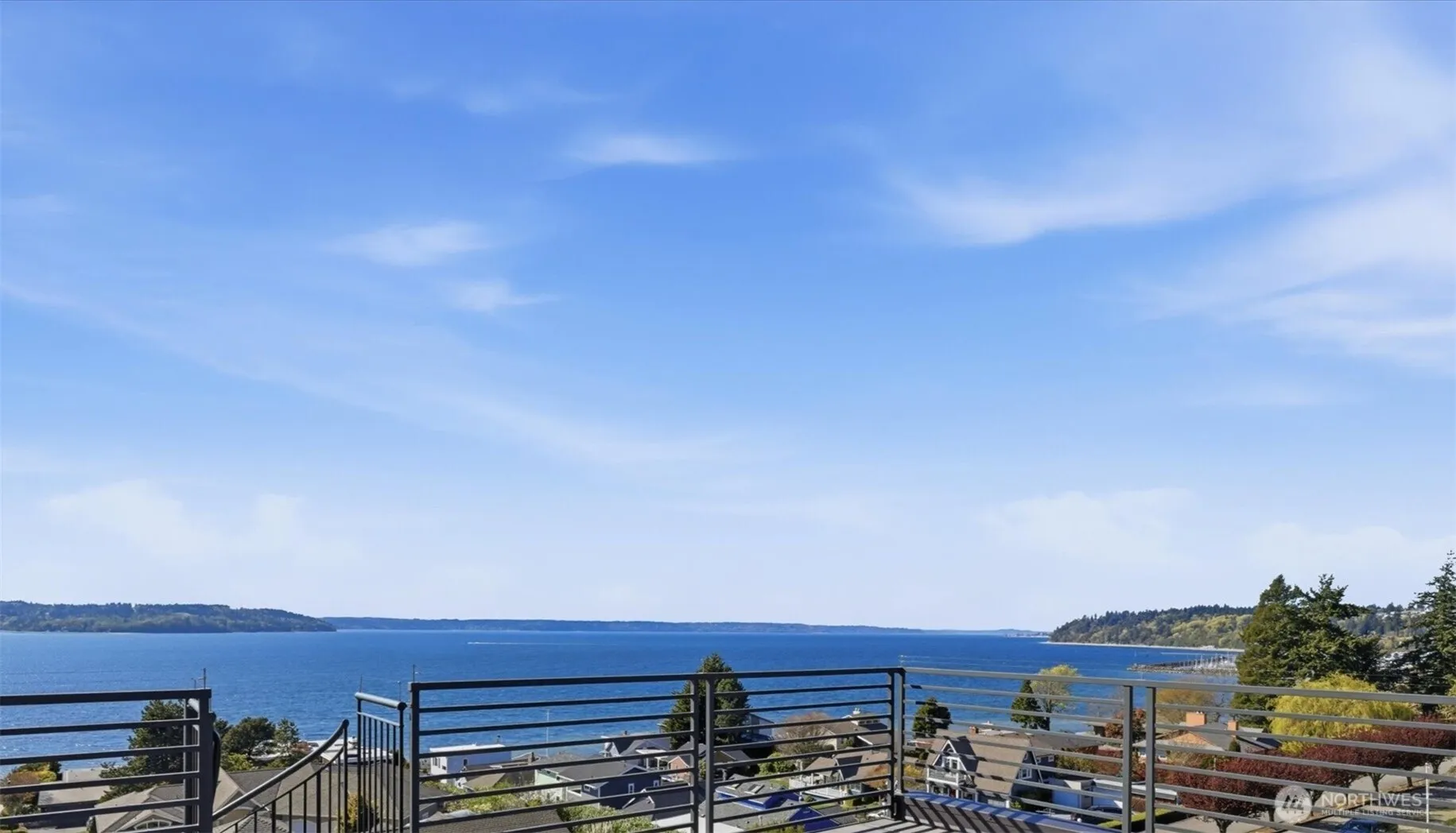 Welcome to luxury living! This one of a kind townhome-style condo showcases breathtaking panoramic views of Puget Sound and the Olympic Mountains from nearly every vantage point. Light and bright main floor features gorgeous hardwood flooring and a cozy gas fireplace, and the beautifully appointed gourmet kitchen featuring quartz surfaces, custom cabinetry, a Sub-Zero refrigerator, and high-end appliances. Expansive windows flood the home with natural light, while three private decks, including a covered main-level deck with infrared heating, provides the perfect setting to enjoy passing ships and unforgettable sunsets. The primary suite offers a true retreat with serene water views, a spacious bath, and private access via a spiral staircase to a spectacular rooftop deck. Additional highlights include a rare 2+car tandem garage, generous storage, central A/C, Hunter Douglas remote shades, and smart-home features. Completely remodeled and updated inside and out, including a full exterior reclad in 2019, this home blends timeless design with modern comfort in a private, quiet community.