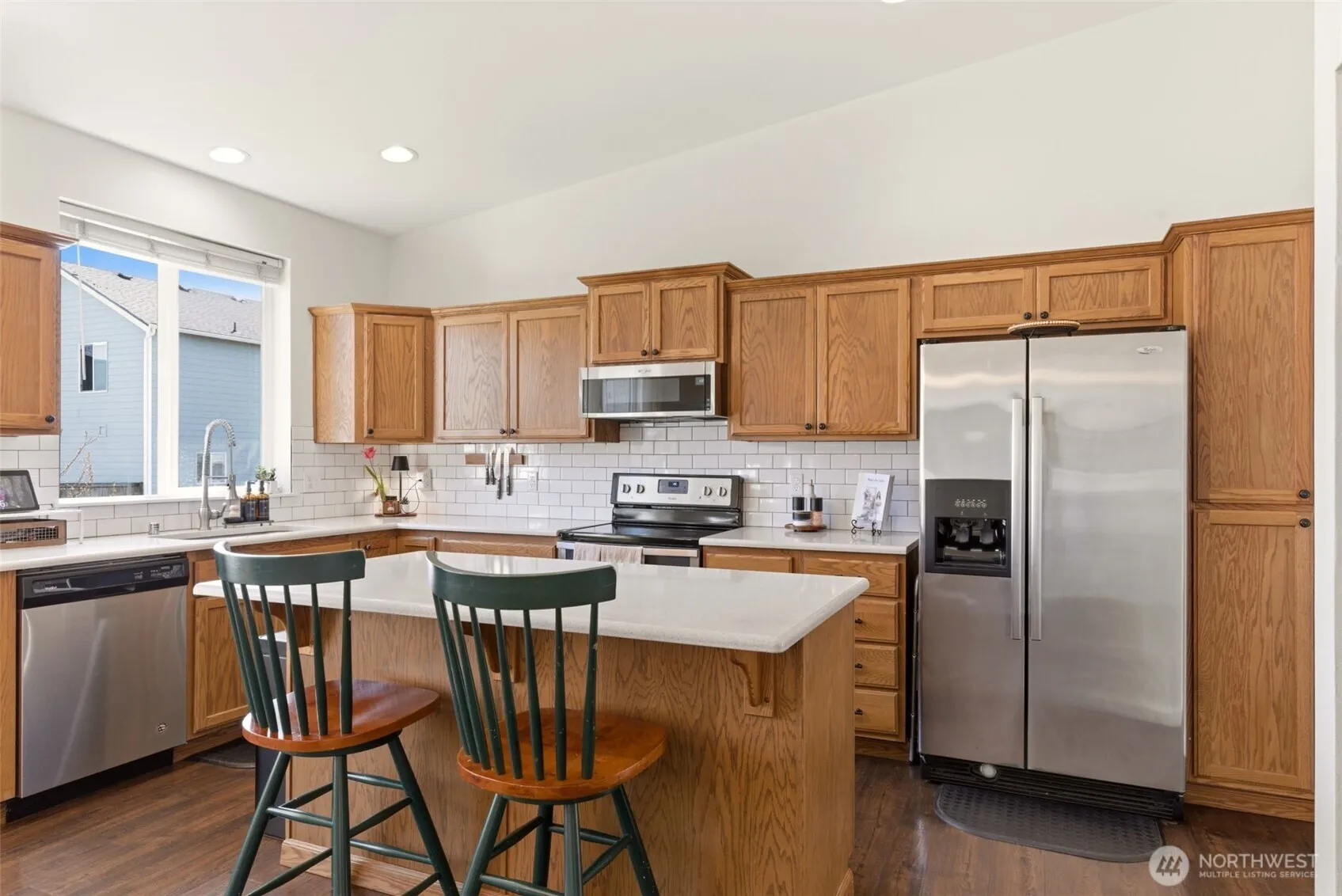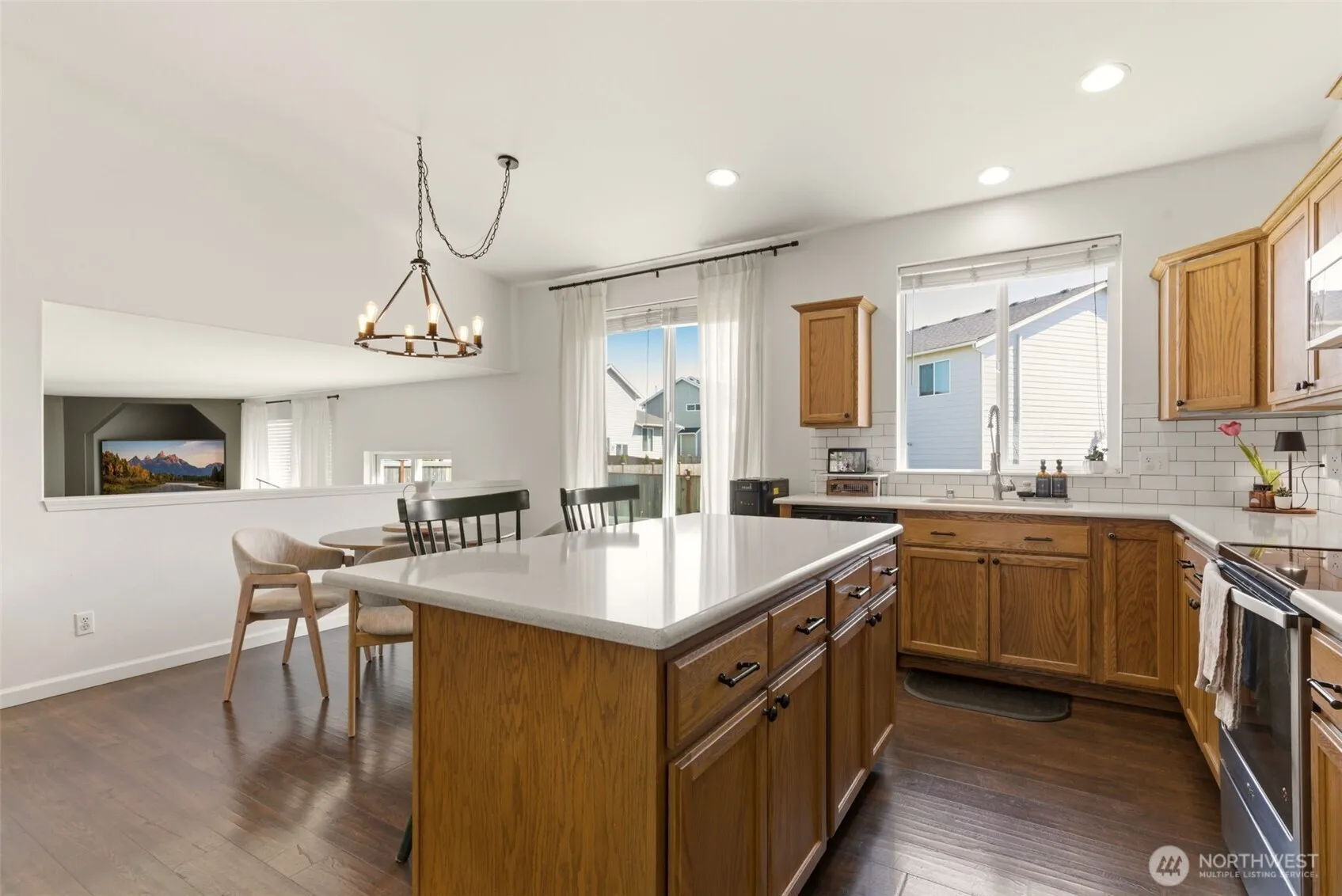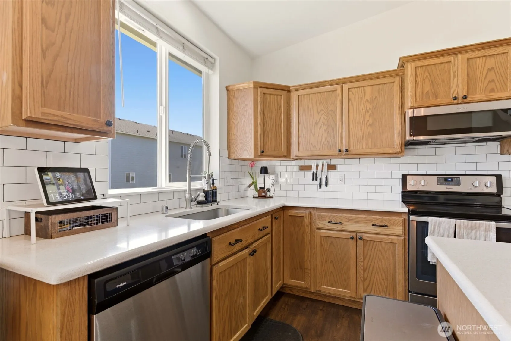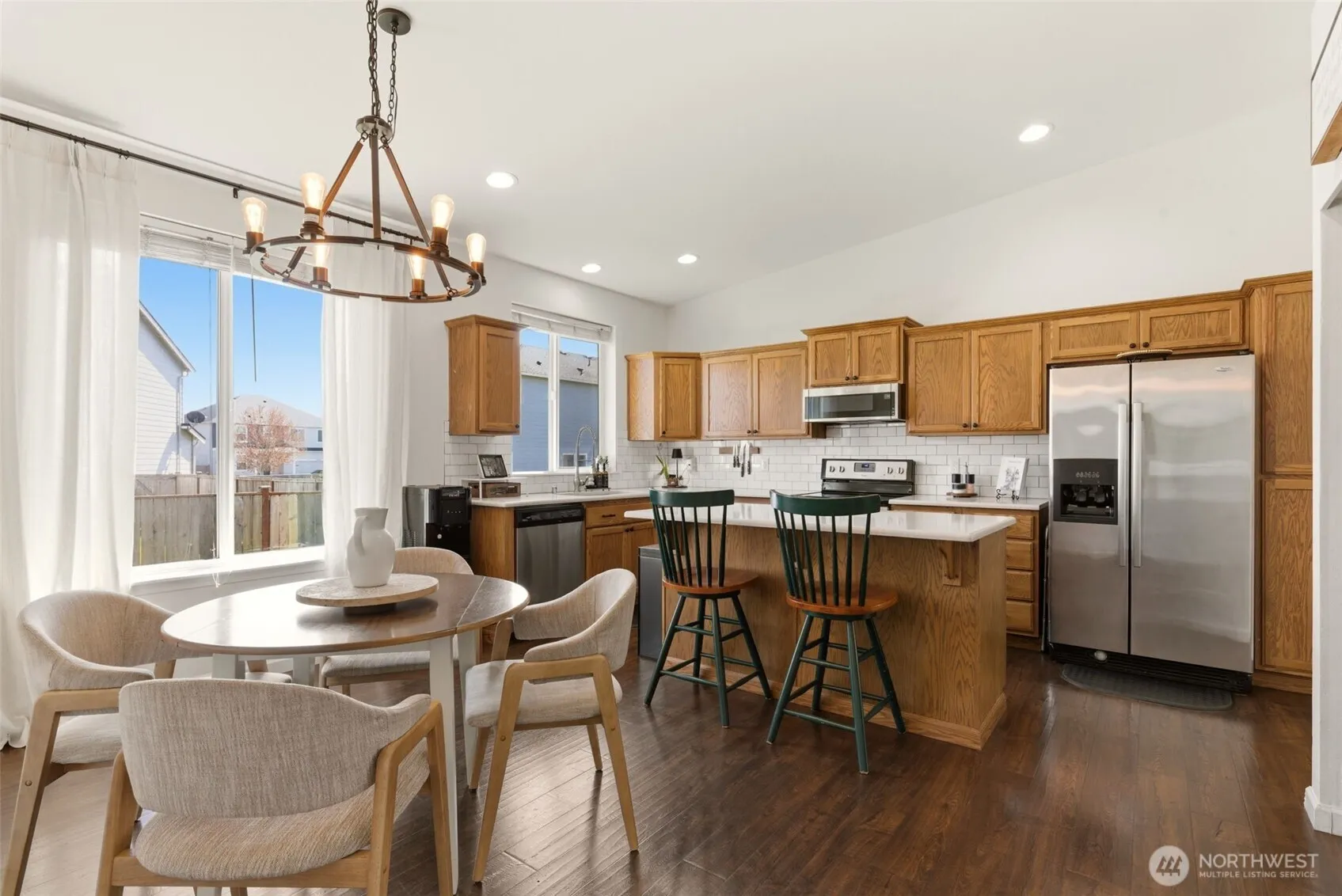 Welcome to this beautifully maintained tri-level offering 2,261 sq ft of open, airy living space in the heart of Yelm. Vaulted ceilings and abundant natural light create a warm, inviting atmosphere throughout the home.The main living area flows seamlessly into the kitchen and overlooks the lower level, creating an inviting flow ideal for daily living and gatherings. The kitchen boasts warm oak cabinetry, a beautiful tile backsplash, stainless steel appliances, pantry, and an island with generous counter space. LVP flooring throughout the main and lower levels adds a clean, durable, and cohesive look.The lower level extends the home with a family room featuring high ceilings, a cozy fireplace with tile surround and mantle, and a slider to the nicely sized, fully fenced backyard with a large patio perfect for gatherings or enjoying the outdoors.One bedroom on the lower level and three upstairs including a spacious 5-piece primary suite offer flexibility and privacy. Freshly painted and cared for with evident pride of ownership, this home is move-in ready.Conveniently located just minutes from schools, shopping, and everyday amenities, and a 25-minute commute to JBLM, this home blends comfort, space, and accessibility in a welcoming setting.