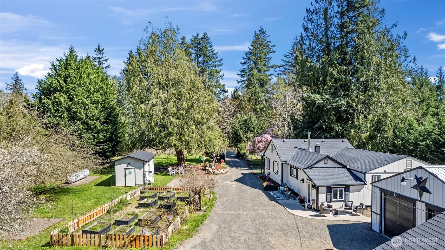 Private Gated Nature Farmstead Retreat in Yelm, shy of 5 acres & surrounded by lush natural beauty & towering virgin cedars! This 1750 sq ft 3 BD + Office/Den & 1.75 Bath Home blends modern comfort w/ refined farmstead living designed for self-sufficiency & off grid lifestyle flexibility! Abundant apple, pear, Italian plum, cherry & kiwi fruit with black walnut/hazelnut trees! Vaulted interiors feature a striking stone backdrop w/ wood stove & beam, designer lighting & seamless flow to a wraparound deck immersed in nature. Spa-inspired primary bth with custom walk-in shower w/artisan tile. Property includes 1125 sq ft shop, finished barn with loft or ADU potential for approx. 600 sq ft of living space and concrete tank pre-installed for future septic! Back area cleared for pasture or ATV trails! 12,000-gallon water reserve tank, propane tank & new systems throughout. Set up for homesteading & back acreage is fenced for farm animals! If horse minded ~ an impressive finished barn w/ loft, built in hen house, and private fenced setting. This property is filled with opportunity, high yield fruit/nut trees, open spaces for animals, dedicated garden beds & newly cleared areas for pasture. Gated lush surroundings & exceptional privacy create a rare legacy property!