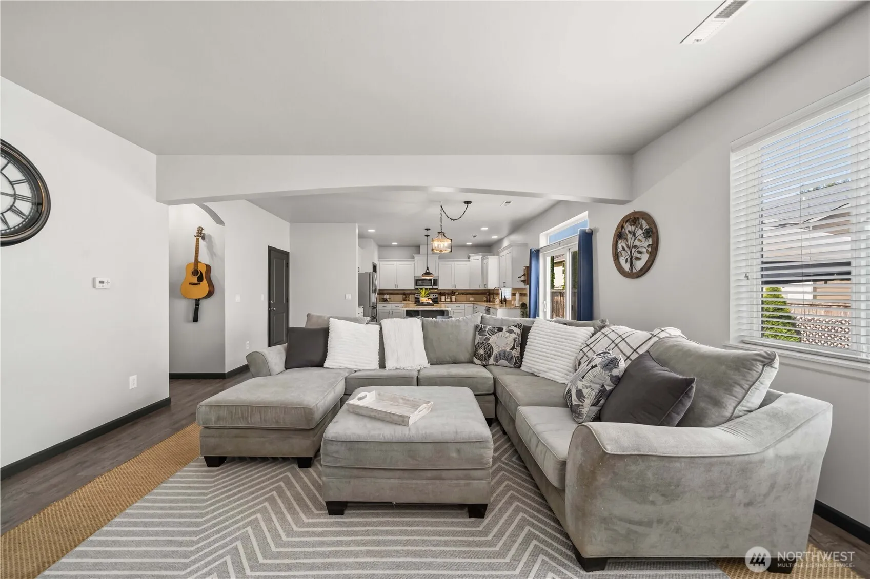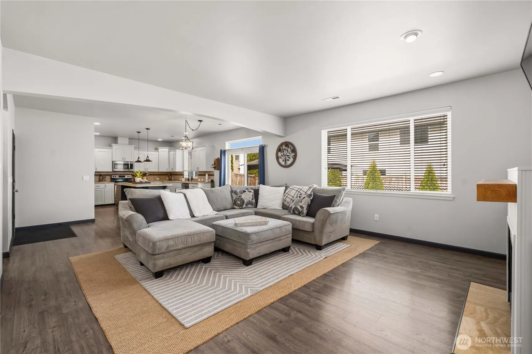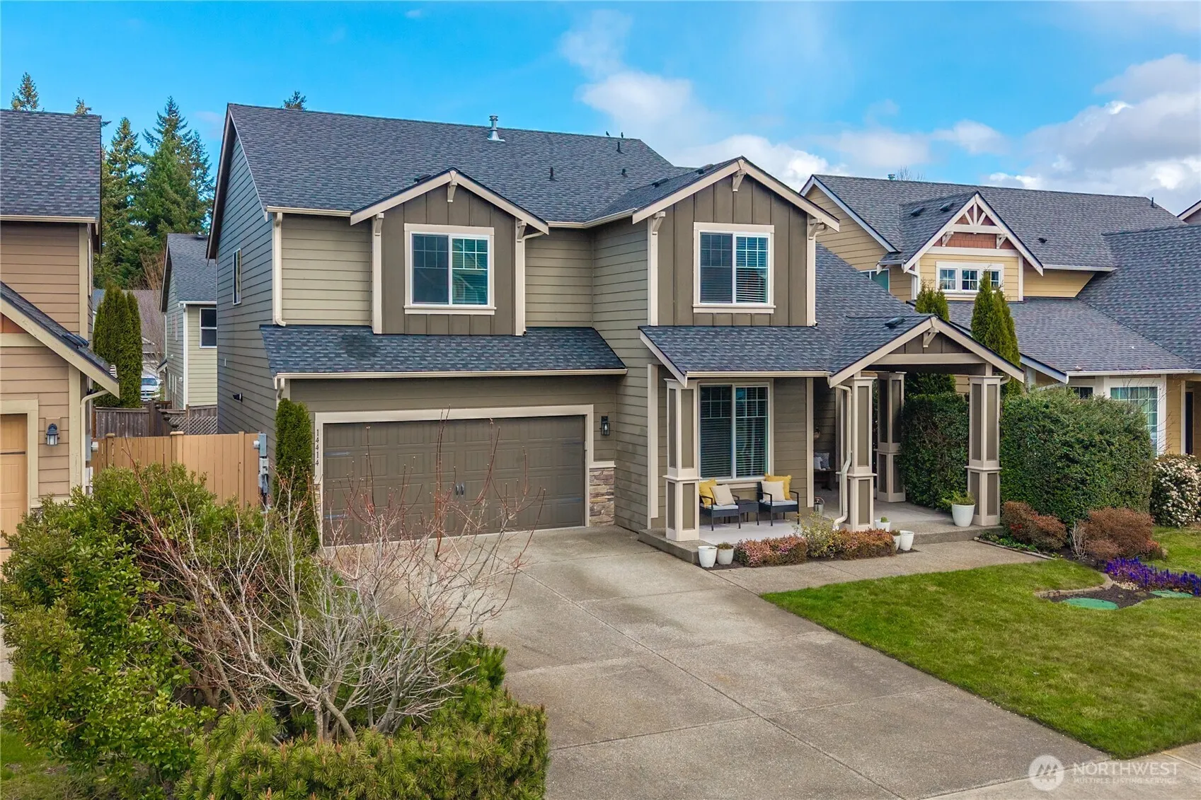 With over 2,400 square feet, this home is built around the kind of open, connected living space that makes everyday life feel effortless. The kitchen is the centerpiece — a large island, granite countertops, and an oversized walk-in pantry anchor the space, flowing naturally into the dining and living areas. Whether you’re hosting a crowd or enjoying a quiet evening in, the layout keeps everyone connected. A dedicated office just off the entry offers a quiet space for working from home or everyday flex use. Upstairs, four generously sized bedrooms provide plenty of room for the whole household. The primary suite features vaulted ceilings, a deep soaking tub, a large walk-in closet, and an en suite bathroom with dual sinks. A second full bathroom with dual sinks serves the remaining bedrooms with ease. Outside, a fully fenced backyard offers room to spread out — whether you’re entertaining guests, letting the pets roam, or simply enjoying the outdoors at the end of the day. Minutes from shopping, dining, and JBLM — this home brings together space, style, and location.