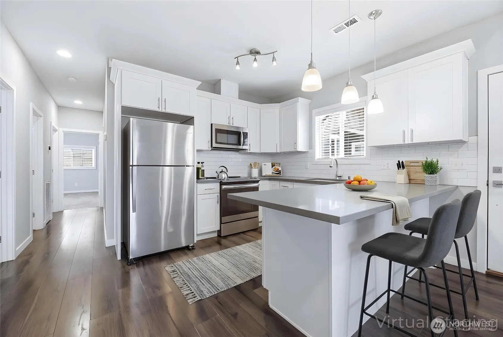 Welcome Home to this Picture-Perfect Rambler in Downtown Enumclaw! This delightfully updated 1,070-square-foot home offers 3 bedrooms, 1.75 bathrooms, and an inviting open-concept living space designed for comfort and easy living. Natural light pours in, creating a bright and cheerful atmosphere throughout. The spectacular updated kitchen shines with quartz countertops, crisp white cabinetry, and sleek stainless-steel appliances — perfect for everyday living and entertaining alike. The generous primary bedroom features its own private bathroom, offering a peaceful retreat at the end of the day. Two additional bedrooms provide flexibility for guests, a home office, or hobbies. Step outside to the back patio — ideal for grilling and relaxing. Prime location just a short walk to downtown Enumclaw’s shops, restaurants, and parks, with quick access to Enumclaw Golf Course, Mud Mountain Dam Park, Mt. Peak hiking trails, and Crystal Mountain. Simple, small-town living at its finest — Home Sweet Home!