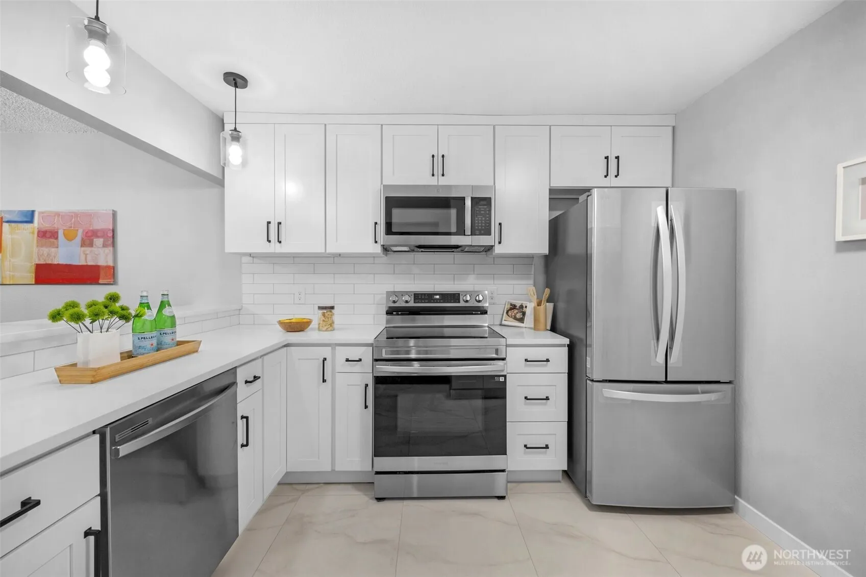 FULLY REMODELED | 1213 SQ FT I STAIR-FREE | 2-BEDROOM | 1.75-BATH I OPEN FLOOR PLAN condo at Sixty-01! Almost everything in this gorgeous condo is brand new! Freshly painted interior, luxury vinyl plank flooring, pristine stainless steel appliances, elegant quartz countertops with chic black lighting and plumbing fixtures! Both bathrooms have dazzling new shower surrounds alongside beautiful new vanities! Sleek electric fireplace that allows you to select the flame color! Convenient stack washer/dryer located in the Primary bathroom. Southeastern sunshine washes across the balcony and spills into the open-concept living room. A delightful outdoor courtyard awaits off the Second Bedroom! Relax under the tree, plant a pea-patch garden, or hang out on the little patio! The covered walkway connects to the adjacent garage that holds your deeded parking space (#635). This condo also has a private, locked, indoor storage room (that’s about 4′ wide, 10′ deep, 7.5′ ft tall) located on the ground floor across from the building elevator. Sixty-01 has secure gated entry, clubhouse, game room, gym, sauna, 4 swimming pools, 3 lakes, 83 acres of trails/parks & more! Near DT Redmond, Google & MS. Easy access to 405/520. Award winning Lake WA schools! No rental cap & no special assessments!