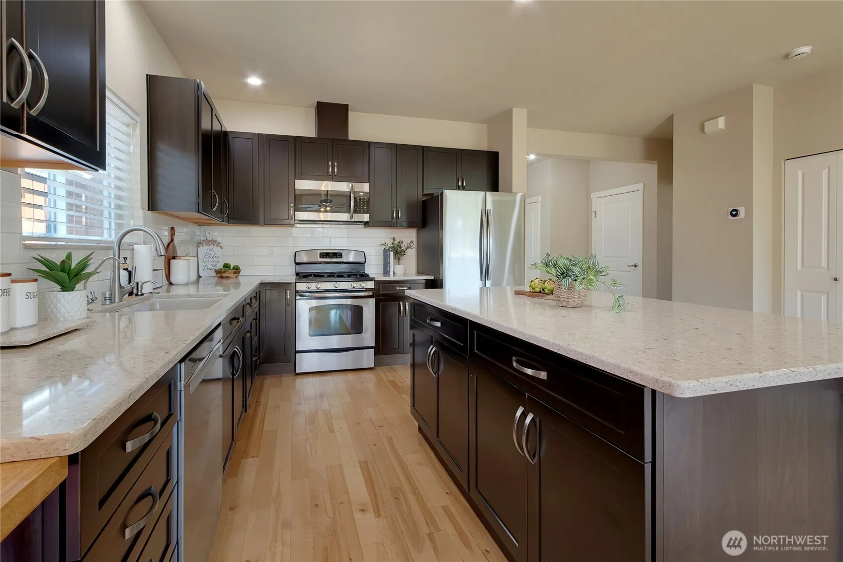 Welcome to Lakeland Hills—an active, sought-after community near Lake Tapps with convenient access to shopping, dining, schools, parks, and endless Pacific Northwest recreation. This turnkey home is move-in ready and offers 3 bedrooms, 2.5 baths, and a fully fenced backyard designed for outdoor enjoyment. Inside, enjoy beautiful hardwood floors throughout the entire main level, updated kitchen countertops, a new refrigerator, custom closet organizers, and ceiling fans throughout. The kitchen also features an additional countertop workspace perfect for a coffee bar, home desk area, or extra baking and cooking prep space. Step outside to a beautifully appointed patio with pergola—ideal for relaxing or entertaining. Enjoy Mount Rainier views from the primary suite. The garage includes added storage and shelving for convenience and organization. Ideally located just minutes from Sunset Park, a 15-acre neighborhood park, and centrally situated between Auburn and Bonney Lake.