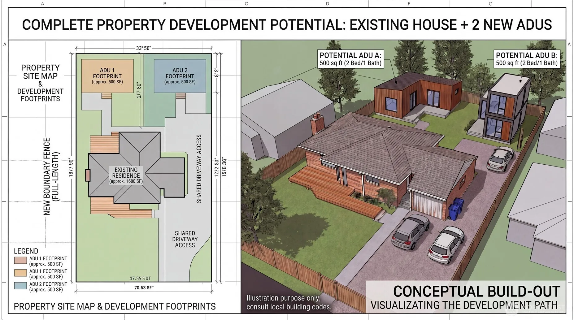 PRIME DEVELOPMENT GEM: MASSIVE 14,600 SF LOT WITH TRIPLE-UNIT POTENTIAL! This sprawling 14,600 S.F property is more than just a home; it is a meticulously planned development site primed for a high-density multi-unit compound. The existing 1,500 SF residence currently generates $3,500 in monthly rent, providing immediate cash flow while you permit. Triple your rental income. Featuring shared driveway access and privacy fencing, this is the ultimate turnkey development opportunity.