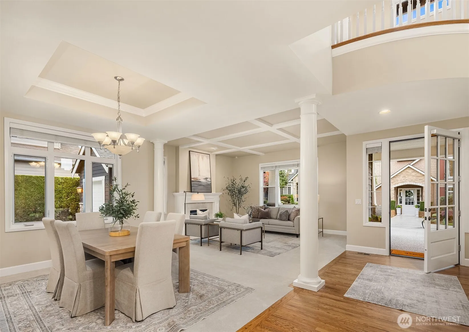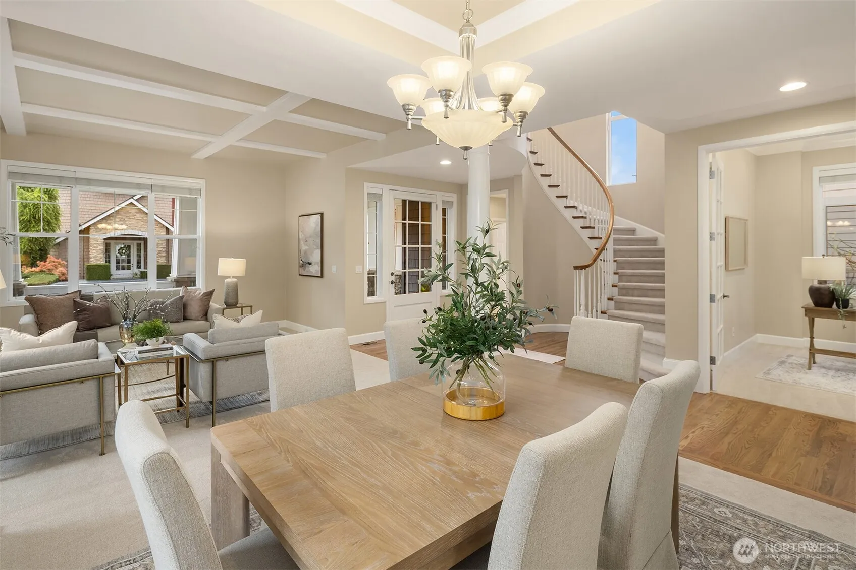 Nestled in coveted north end of Sammamish plateau, in top-rated LWSD, this exceptional home backs to serene greenbelt on quiet cul-de-sac in The Vintage, offering direct access to community playground, athletic court, & soccer fields. This 4bed/4bath home seamlessly blends elegance & functionality. A grand entry creates unforgettable first impression w/soaring ceilings of box beam & coffered details, refinished hardwood floors & stately columns anchoring formal living & dining room. Dramatic spiral staircase leads to luxurious primary suite, w/vaulted ceilings, soft ambient lighting, spa-inspired ensuite w/soaking tub, glass-enclosed shower, dual vanities & expansive walk-in closet. Natural light illuminates family room w/gas fireplace & custom built-ins. Space flows effortlessly into beautifully appointed chef’s kitchen w/oversized granite island, rich cherry cabinetry, gas cooktop, double ovens, walk-in pantry, butler’s bar, & sunny dining nook w/planning desk. Large main floor home office. Upstairs, 3 add’l bedrooms including private ensuite ideal for guests/multi-generational living. Generous bonus room offers endless flexibility, perfect for media room, game space, home gym, add’l office. Fully fenced backyard designed for entertaining & relaxation w/stunning tiered flagstone patio, a 6-person hot tub, tranquil water feature, level lawn, & raised garden beds. A/C for year round comfort. Oversized 3-car garage + detached 1-car garage, exceptional storage & flexible use.