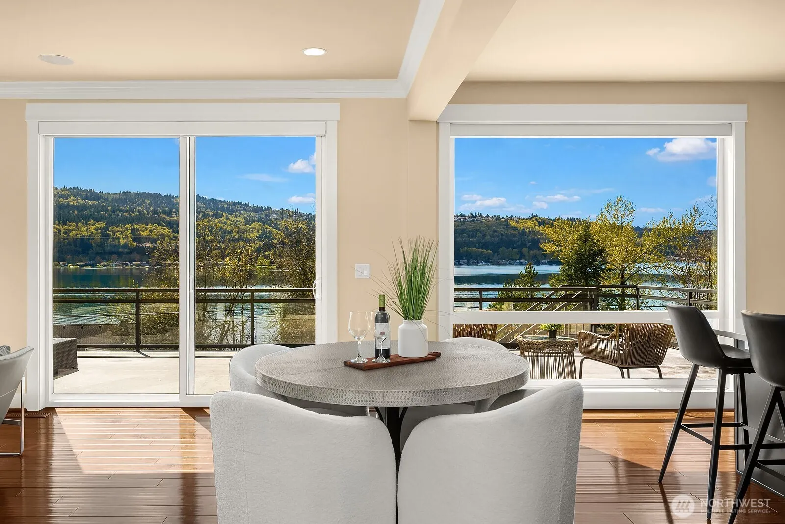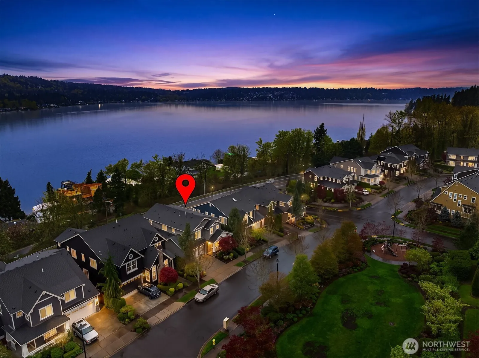 Located within Shorelane Vistas, this stunning 5 bedroom, 3.25 bath home captures panoramic Lake Sammamish views from all three levels and delivers a lifestyle of elegance, comfort, and natural beauty. Soaring ceilings and classic wainscoting set a tone of sophistication through the formal living and dining rooms, each curated with elevated finishes and designer touches. The chef worthy kitchen features an expansive granite island with generous storage flowing into a warm sunlit family room with gleaming hardwood floors. Retreat to the luxurious primary suite with spa inspired appointments, a lavish 5-piece bath, sweeping water views, and custom California Closets built ins. Secondary bedrooms also feature California Closets and appointed bathrooms. The lower-level bonus room with private guest suite and patio access is ideal for guests or extended stays. The heated lower patio and upper deck with stairs to the yard make outdoor entertaining effortless. The fenced backyard features professionally installed irrigation, landscape lighting, and a direct plumbed fountain for a low maintenance retreat. The dream garage is fully finished with custom shelving and upgraded flooring. Premium upgrades include a whole-home generator, central air conditioning, an EV charger, and new carpet. Served by the top-rated Issaquah School District with easy access to amenities, dining, and commuter routes, this exceptional home is as convenient as it is spectacular.