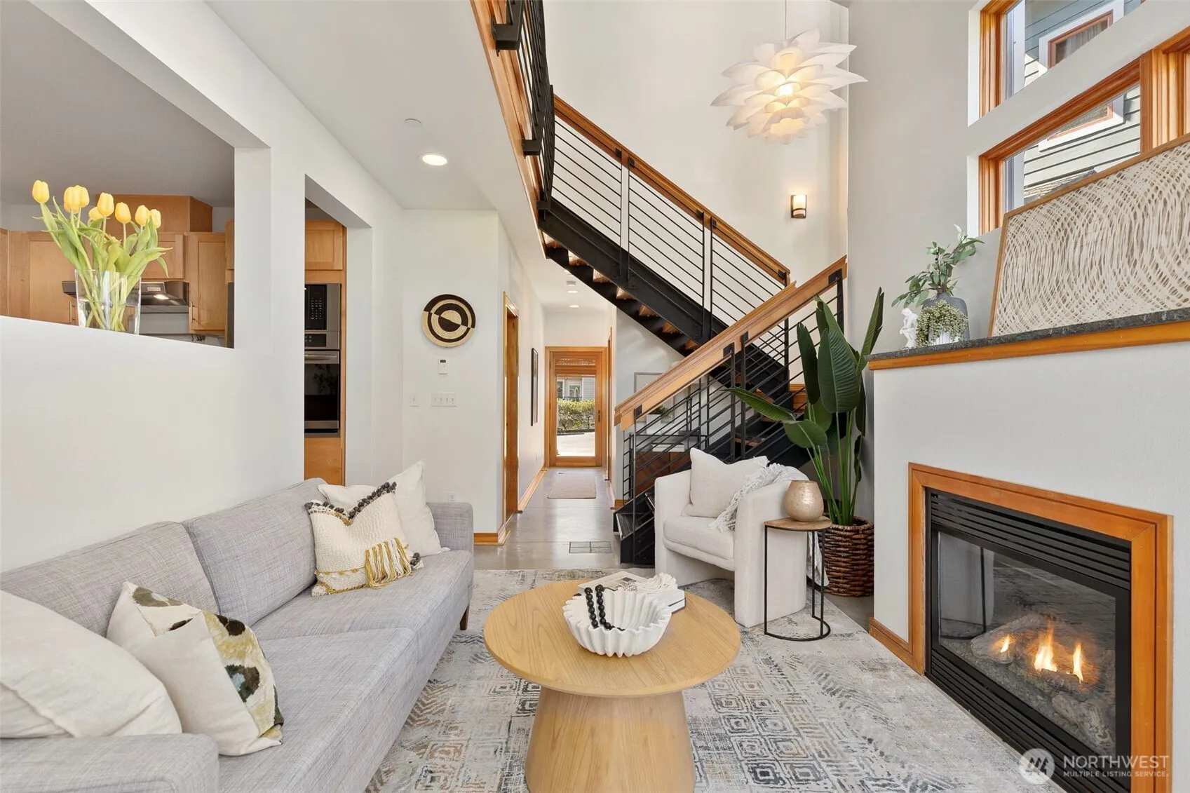 Tucked just off Madison Avenue, this Winslow townhome offers genuine walkability to town without the feel of being in it. Soaring cathedral ceilings and walls of windows give the main floor a scale and light that’s rare in a townhome. Radiant-heated concrete floors run the main level, anchored by a propane fireplace and a kitchen with maple cabinetry, honed granite countertops, a generous island, and dining access to a private garden patio. Upstairs, heated bamboo floors carry through the upper level. The primary suite includes an en suite bath, marble countertops, and a California Closets walk-through system. Two additional bedrooms and a full bath complete the upper level — one bedroom could easily serve as a home office. The private patio extends living space year-round. Rooftop solar, a fire sprinkler system, and updated kitchen appliances reflect a home that’s been thoughtfully maintained. A one-car garage rounds out the practical side — covered parking and storage this close to Winslow is a genuine advantage. One block from everything Winslow has to offer, tucked into a peaceful enclave — convenience without compromise!