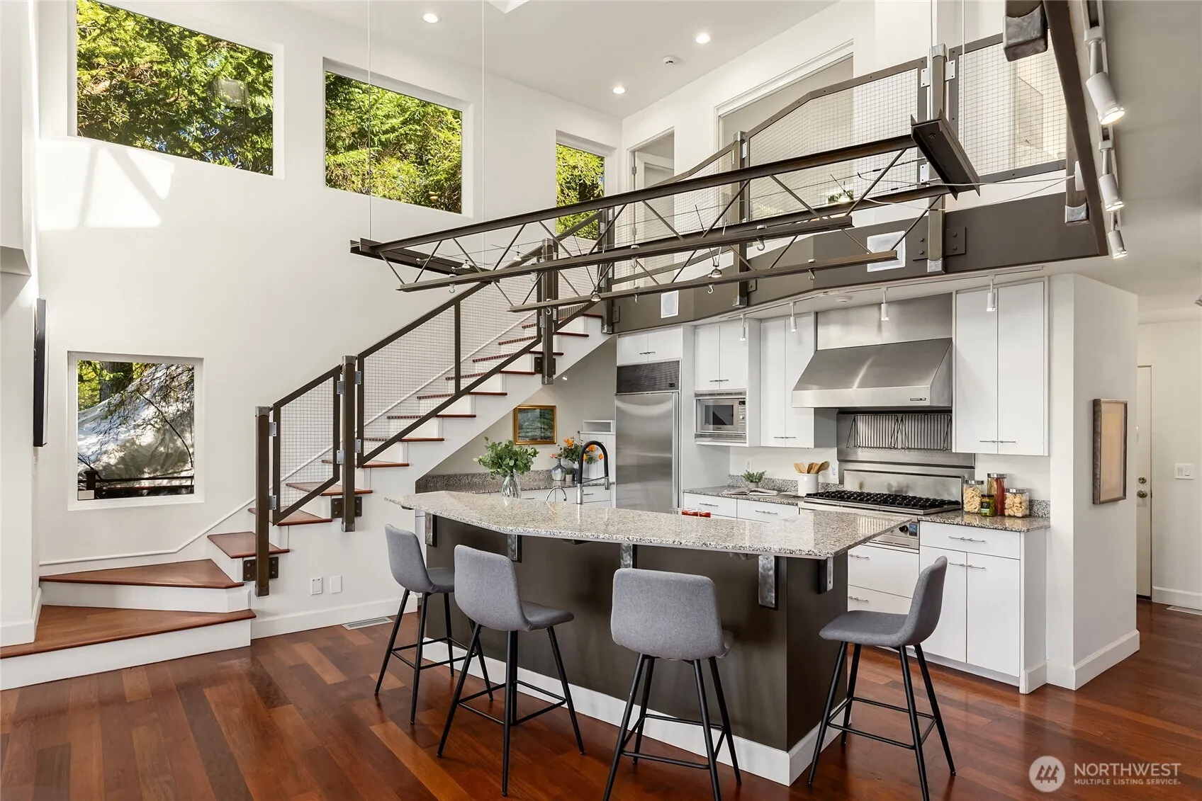 A refined expression of post-modernism by renowned Seattle architect John Brenneis, set in a stunning waterfront setting with sweeping Olympic Mountain and Puget Sound views from every room, abundant natural light, and unforgettable sunsets. Masterfully designed for both style and function, the airy open floor plan centers around a dramatic 2-story kitchen and dining space crowned by a pyramidal skylight. The layout offers 3 ensuite bedrooms plus an office, including a spacious primary suite with dual walk-in closets, a spa-like bathroom, and a private deck. The spacious main level invites indoor-outdoor living, with seamless access to the fully fenced waterside patio and landscaped yard, set against sweeping water and mountain views. Follow the solid beach stairs to your own ±90 feet of bulkheaded shoreline, dotted with oysters and anchored by a distinctive natural boulder, a rarity along Bainbridge’s shoreline, with your own deep-water mooring buoy for days on the water. Set on a quiet street with a tree-lined approach, the property includes partial ownership in the 4.7-acre forested lot across the road. In the highly sought-after Arrow Point neighborhood, an active island lifestyle is just a stroll away at Battle Point Park, offering 90 acres of open space, trails, ponds, summer concerts, and sports courts (pickleball, basketball, soccer, softball, tennis). A rare opportunity for those drawn to modern design, an active lifestyle, and waterfront living.