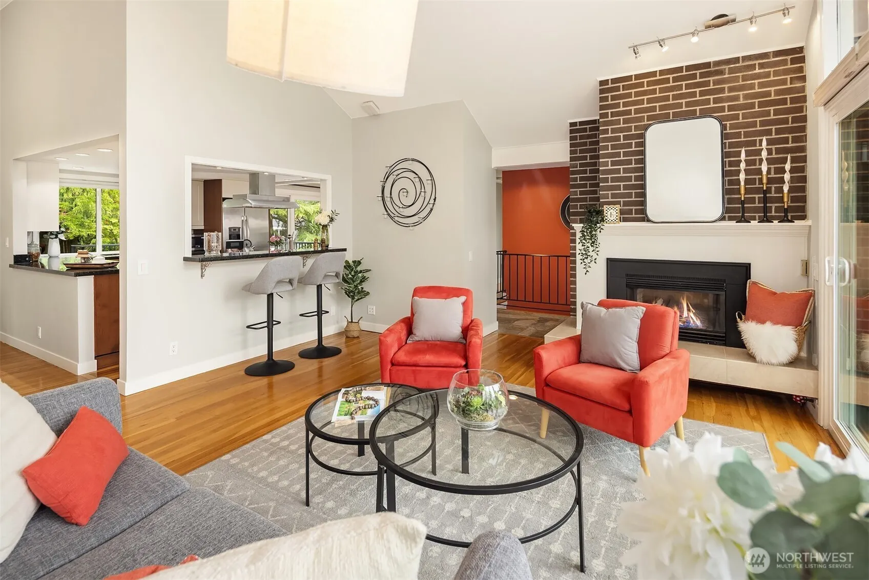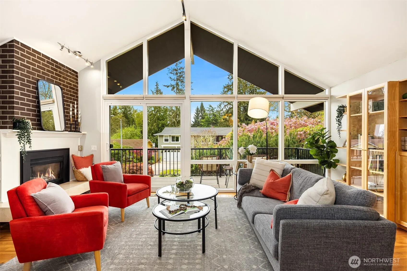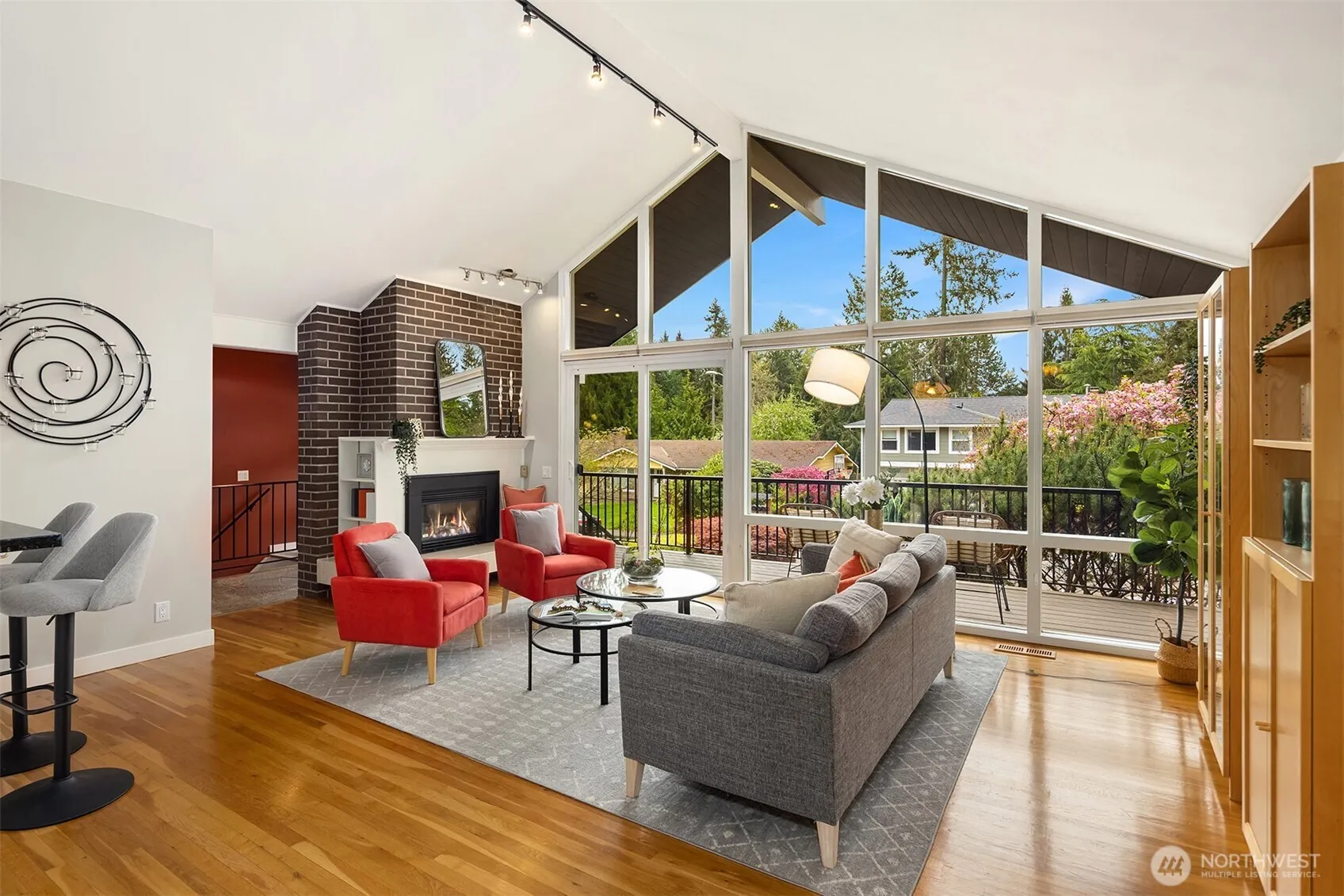 Sunlit 2-story home with a mid-century vibe in the Bretton Wood community of Bellevue sits on a beautifully landscaped parklike lot. Formal living area off the entry features a vaulted ceiling and south-facing, floor-to-ceiling windows that illuminate the interior with natural light. Modern kitchen with built-in breakfast nook and abundant cabinet space opens to a newer deck overlooking a true backyard retreat. Spacious primary bedroom with dual closets and an ensuite bath. Two additional bedrooms and a full bath complete the upper level. Lower level recreation room with MIL potential includes a kitchen, dedicated office space, a full bath and fourth bedroom with private entry. Fully fenced rear yard offers expansive garden and patio space, surrounded by mature landscaping & fruit trees bursting with perennial color, making it incredibly peaceful and private. Thoughtful improvements include A/C, solid-core interior doors, surround sound and a brand-new roof. Access to the highly sought-after Bennett Elementary & Interake High schools and nearby Tam O’Shanter Park. Minutes to Microsoft, shopping and light rail. A true gem, don’t wait!