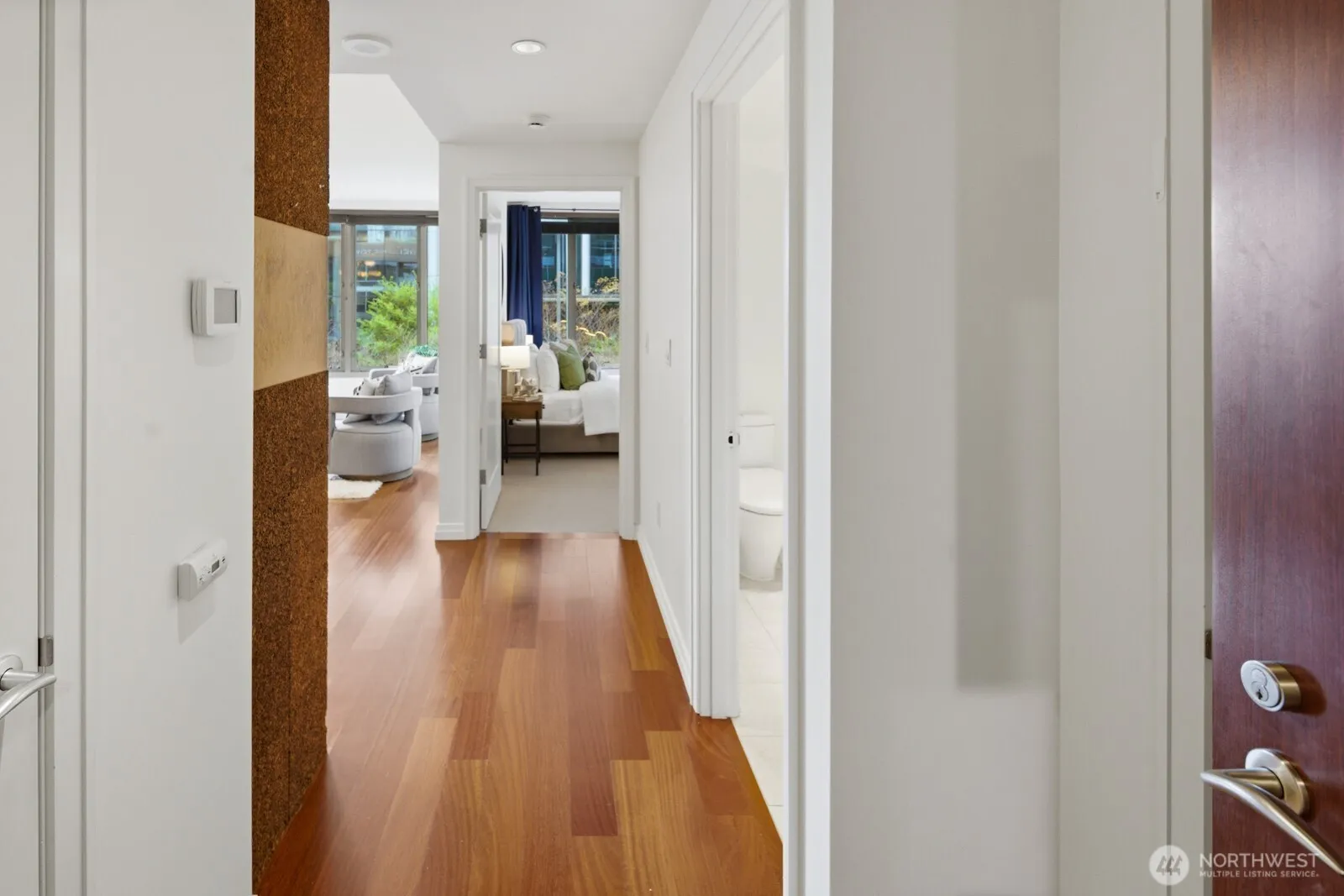 Some homes are just bought. This one was curated. When the owners learned two storage units had come available for purchase, rare in this building, rare in this city, they moved immediately. When EV charging became an option for their parking space, same story. This is a home that reflects the instincts of people who knew exactly what future-you would want. The unit sits at the end of the hall, quieter, more private, steps from a one-way exit onto 106th that puts Bellevue Square and Safeway at your elbow. Hardwood floors catch the light throughout an open layout anchored by cabinetry painted by muralist Ann Gates Fiser, original to the building, one of those details that stops visitors mid-sentence. Your parking space is on the same level as the lobby and your front door. No elevator math. Just life, simplified. The building does the rest. Two fitness spaces with separate locker rooms. A full spa suite: hot sauna, steam room, hot tub, cold dip, outdoor deck. A dining room seating 16 with a full kitchen and private terrace. A reservable party floor and casual sixth-floor lounge. Rooftop terraces with gas BBQs. Screening room. Dog park. Concierge, around the clock. These are the same amenities enjoyed by residents in units three times the price. The building doesn’t know what floor you’re on. Electric bills average $60/month. Gas, water, and building upkeep are covered by dues. Some people find a home. This one was earned, one smart decision at a time.