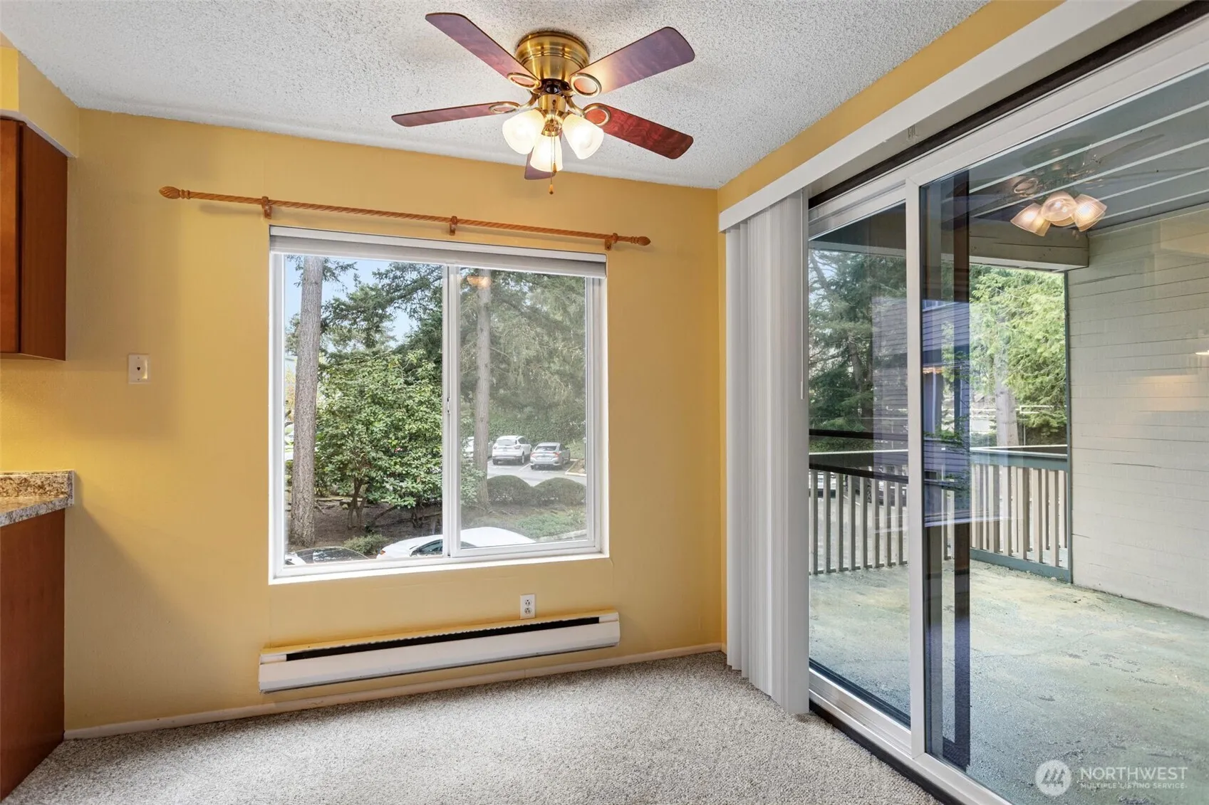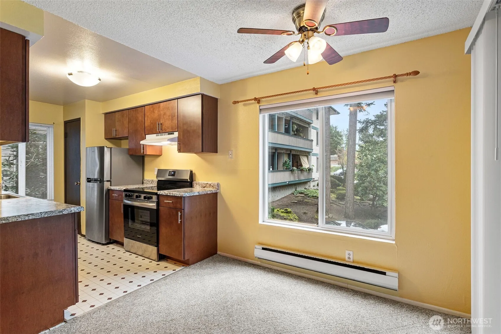 LOCATION! Welcome to this bright and inviting condo featuring a spacious, open-concept living and dining area filled with natural light. Large windows and a sliding glass door create a seamless connection to the outdoors, offering peaceful views and easy access to a private balcony—perfect for relaxing or entertaining. The kitchen is thoughtfully designed with warm wood cabinetry, ample counter space, and modern appliances, making meal prep both functional and enjoyable. Adjacent to the kitchen, the dining area is highlighted by a large window and ceiling fan, creating a comfortable space for everyday living. The generously sized bedroom offers a quiet retreat with plush carpeting and plenty of room to unwind. Neutral tones throughout provide a clean, versatile canvas ready for your personal touch. Additional features include abundant natural light, efficient layout, and a cozy, welcoming atmosphere throughout. Walking distance to the light rail. Conveniently located near shopping, dining, I5/405, and everyday amenities, this home offers both comfort and convenience. Don’t miss the opportunity to make this charming space your own!